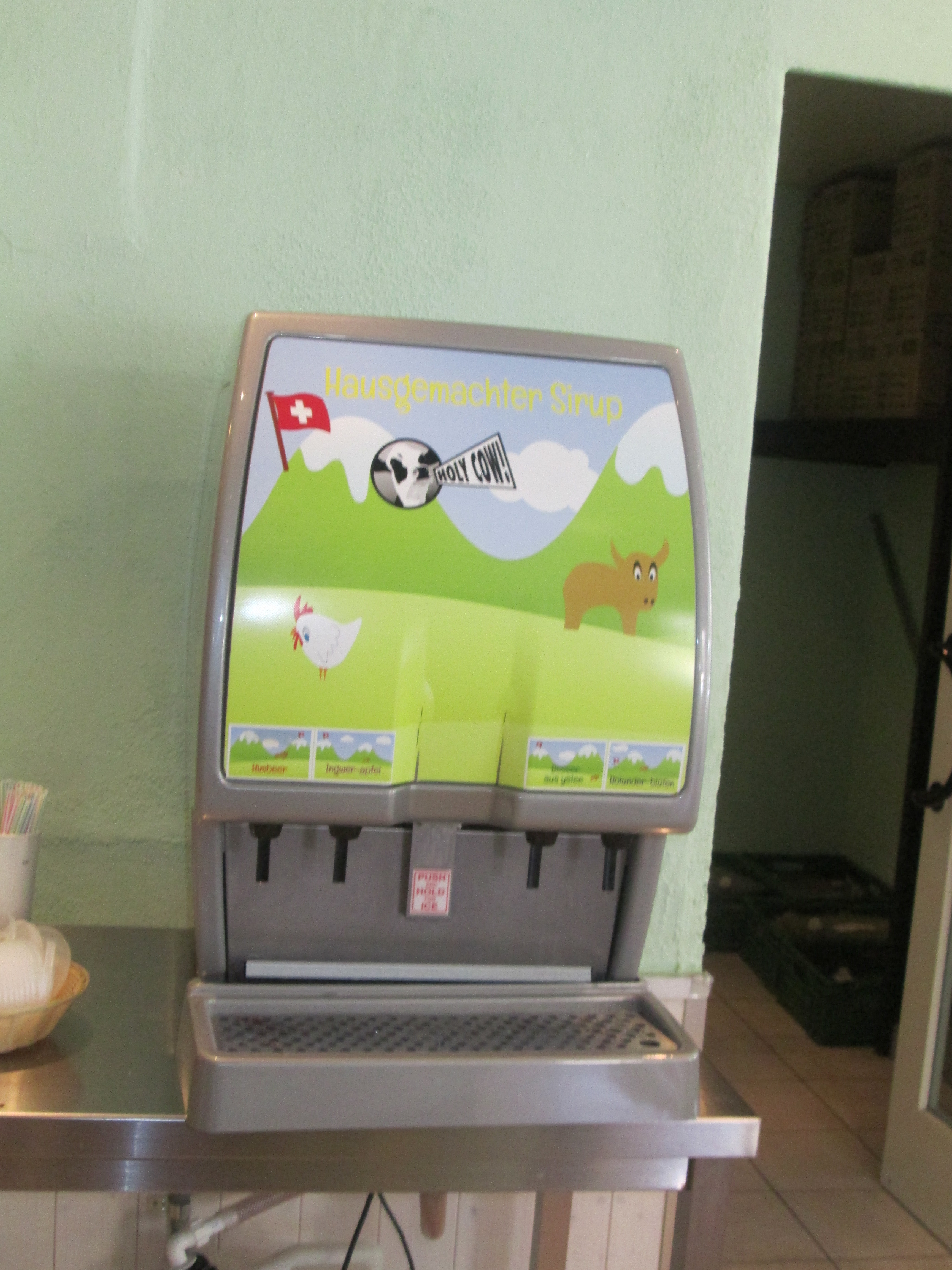 Holy Cow! was founded in Lausanne (the chain has two outlets in Lausanne, two in Geneva and one in Lille) and the Zurich outlet on Zähringerstrasse 28 opened fairly recently. The restaurant has a comfortable and relaxed feel to it, long trestle tables with strategically placed ketchup bottles and napkins; wooden benches and a great big syrup machine where you can get free refills (the Swiss like to drink syrup mixed with mineral water, a bit like the “diabolo” in France).