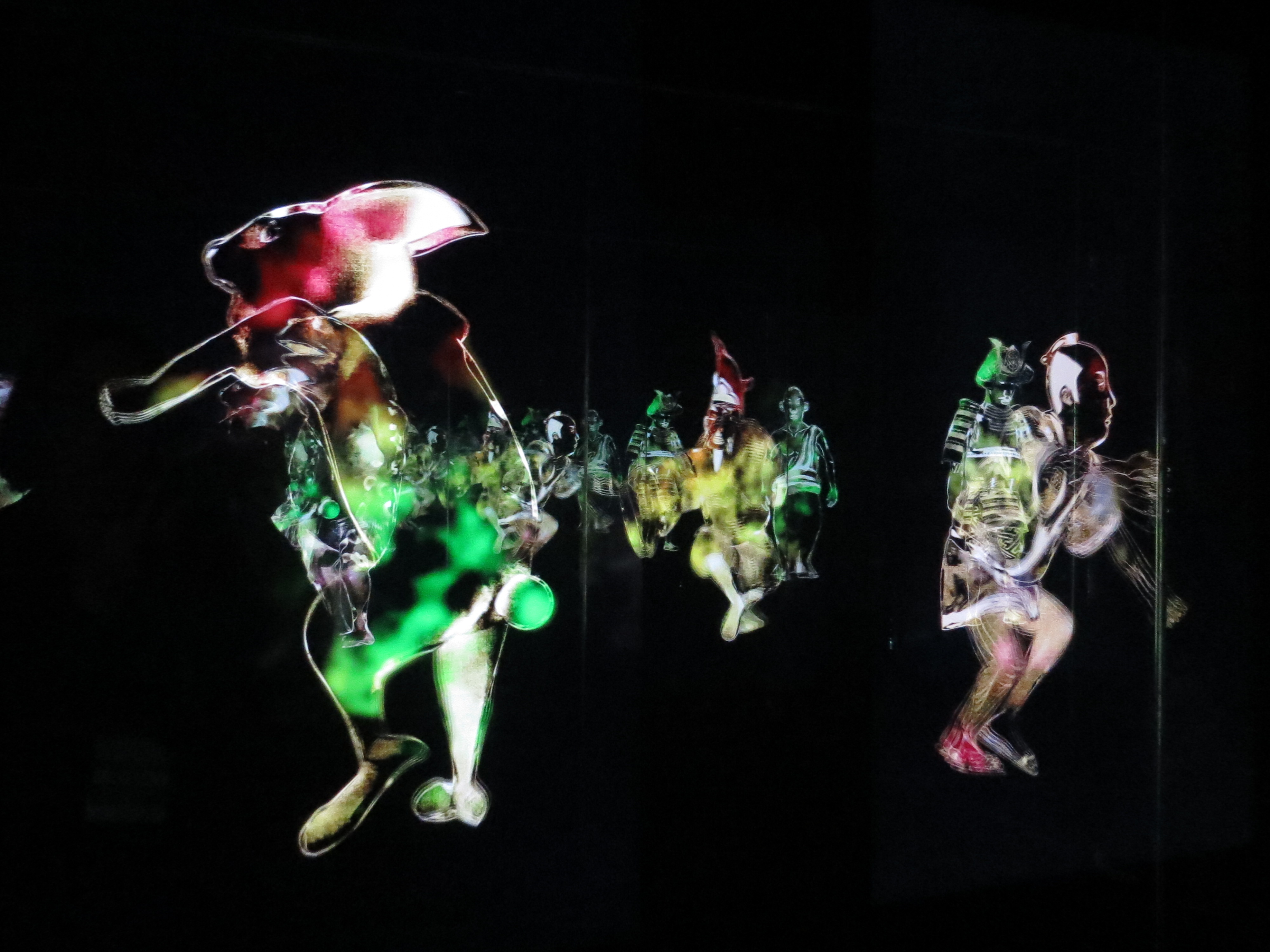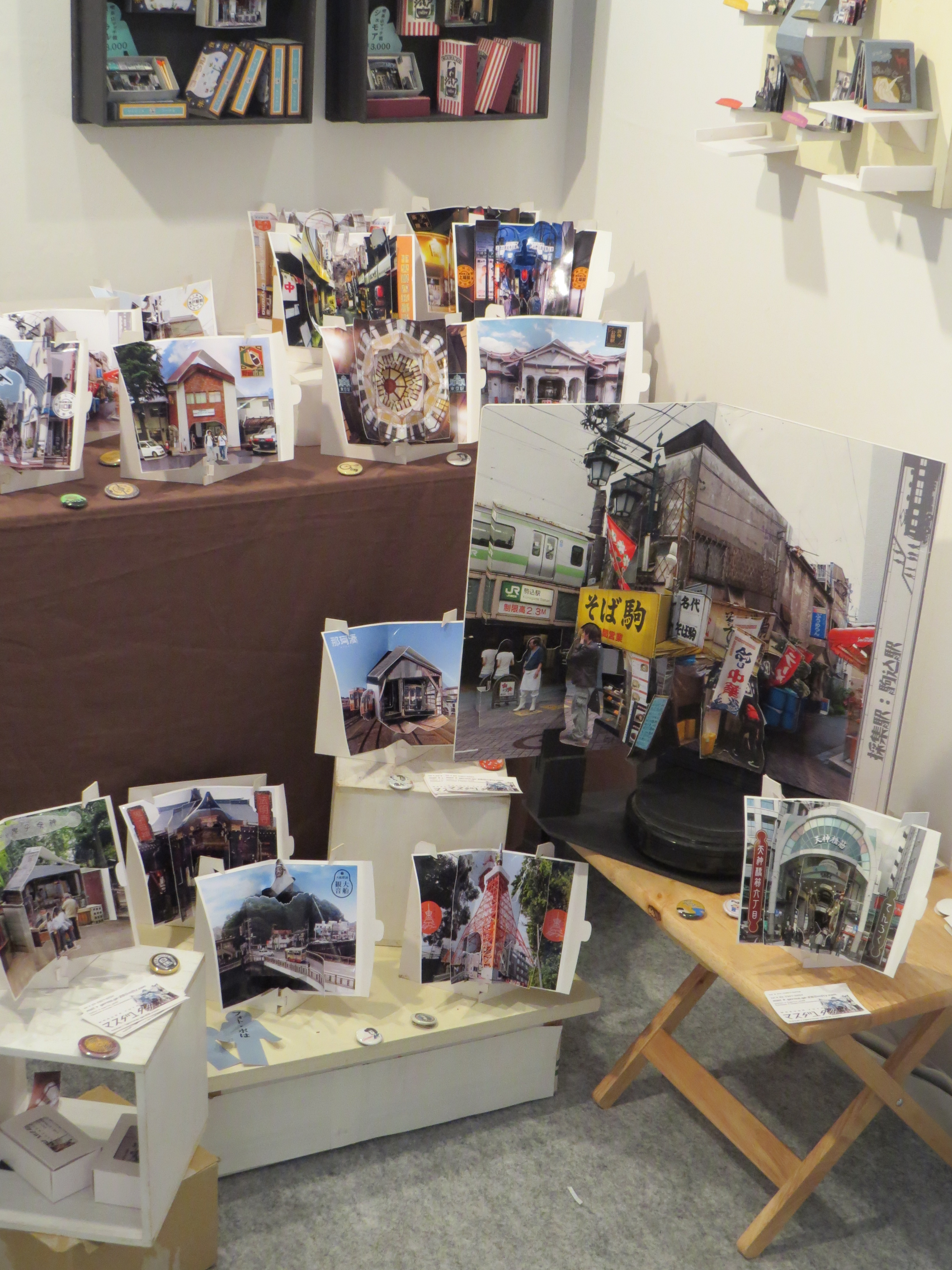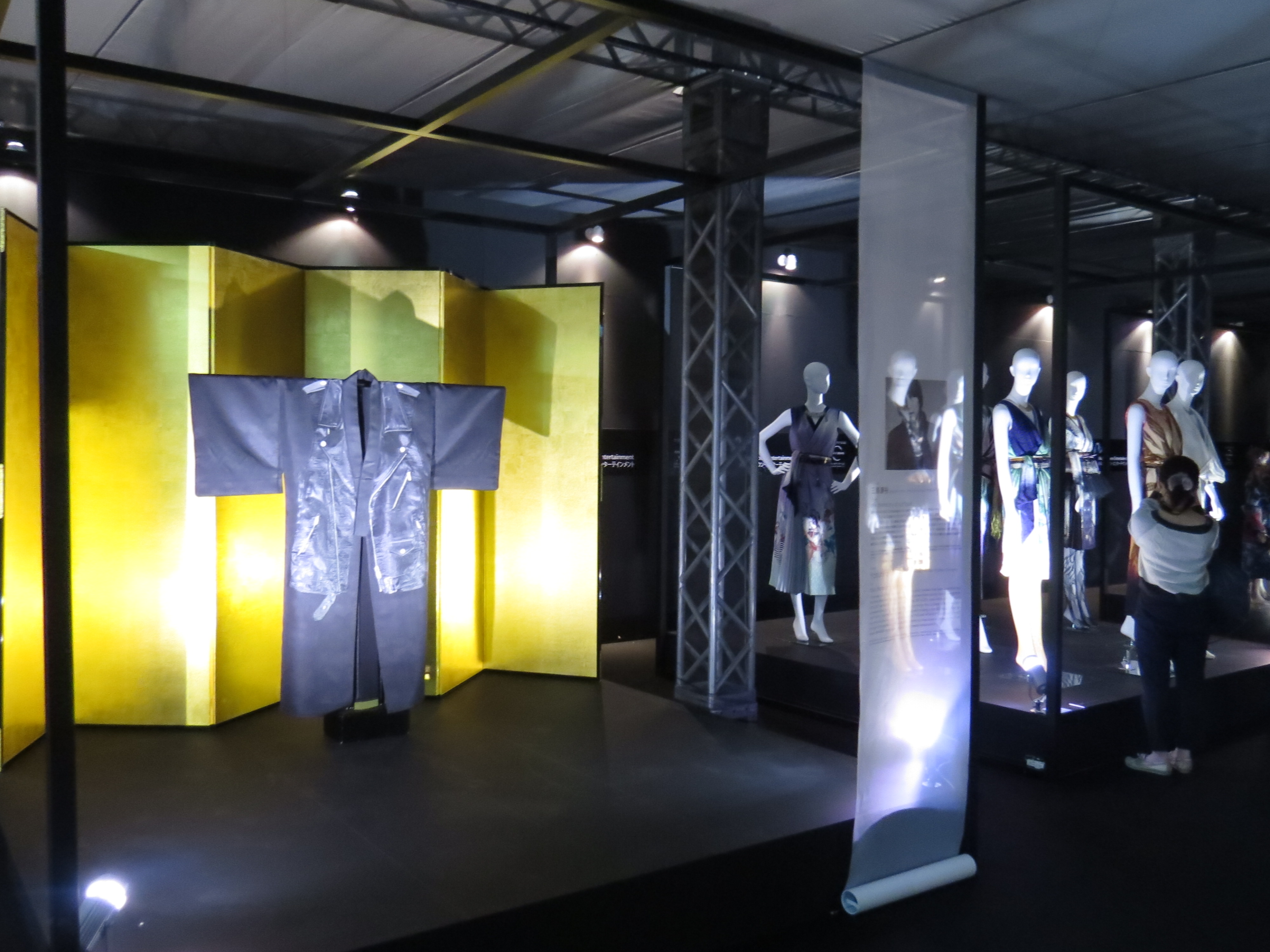 In the TDWA Art Fair tent I was charmed by the photo fold-out cards and booklets by artist Masuda Yutaka – he makes photo models, transforming 2D photos into 3D cut-outs – ingenious and very artistic. Check out his work online. Digital artist Toshiyuki Inoko’s stunning digital installation “Infinity of Dancing People on the Wayside” was in a curtained off cubicle in the Kimono exhibition area. Imagine a dark space, LCD screens all around you and digitized animals or animal/human hybrids (it was difficult to say), dancing and swaying in a multitude of different colours….it was mesmerising! And in the Hokusai Manga exhibition I particularly liked the “future fashion design” drawings by Japanese fashion designer Kosuke Tsumura.