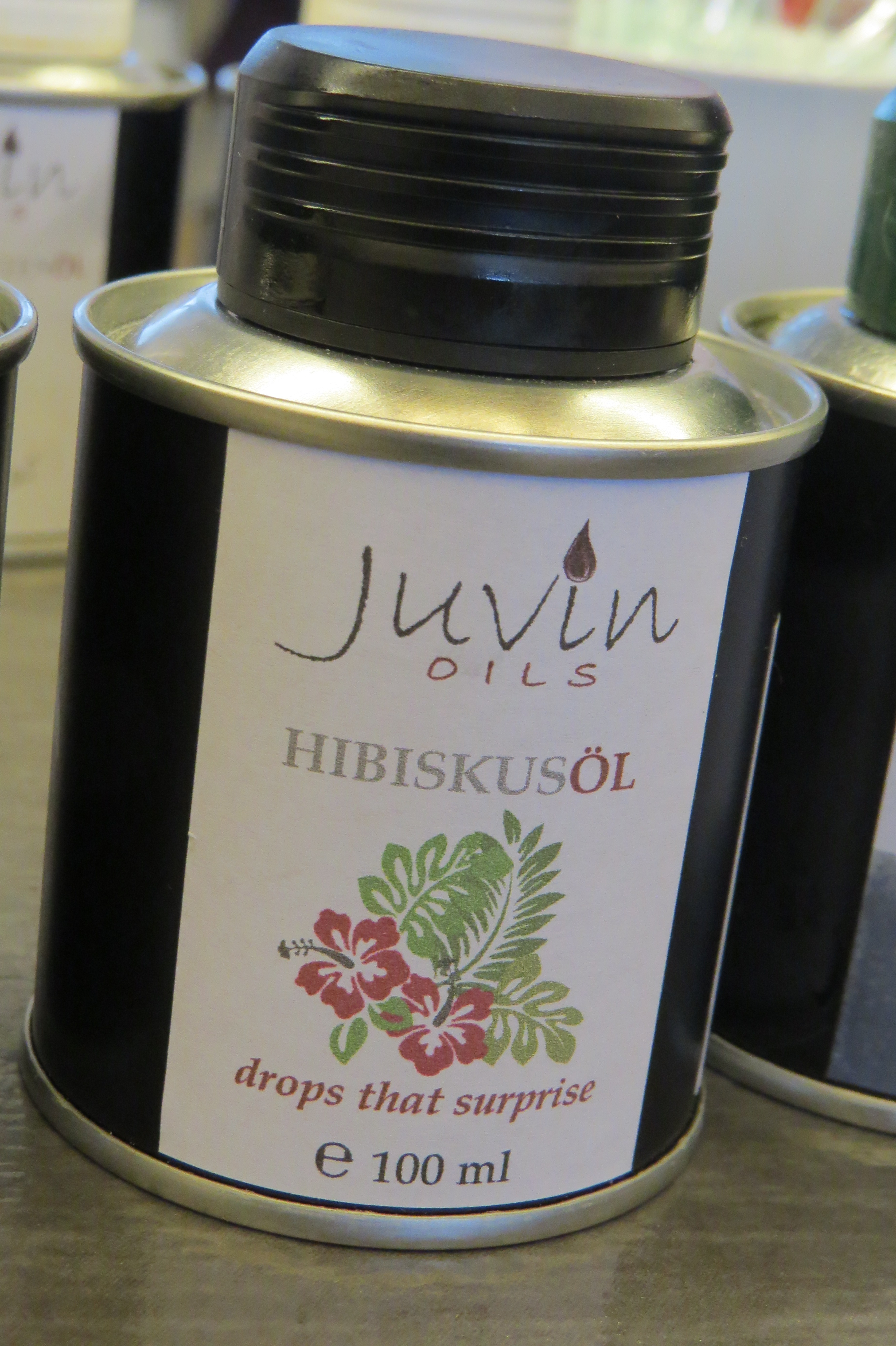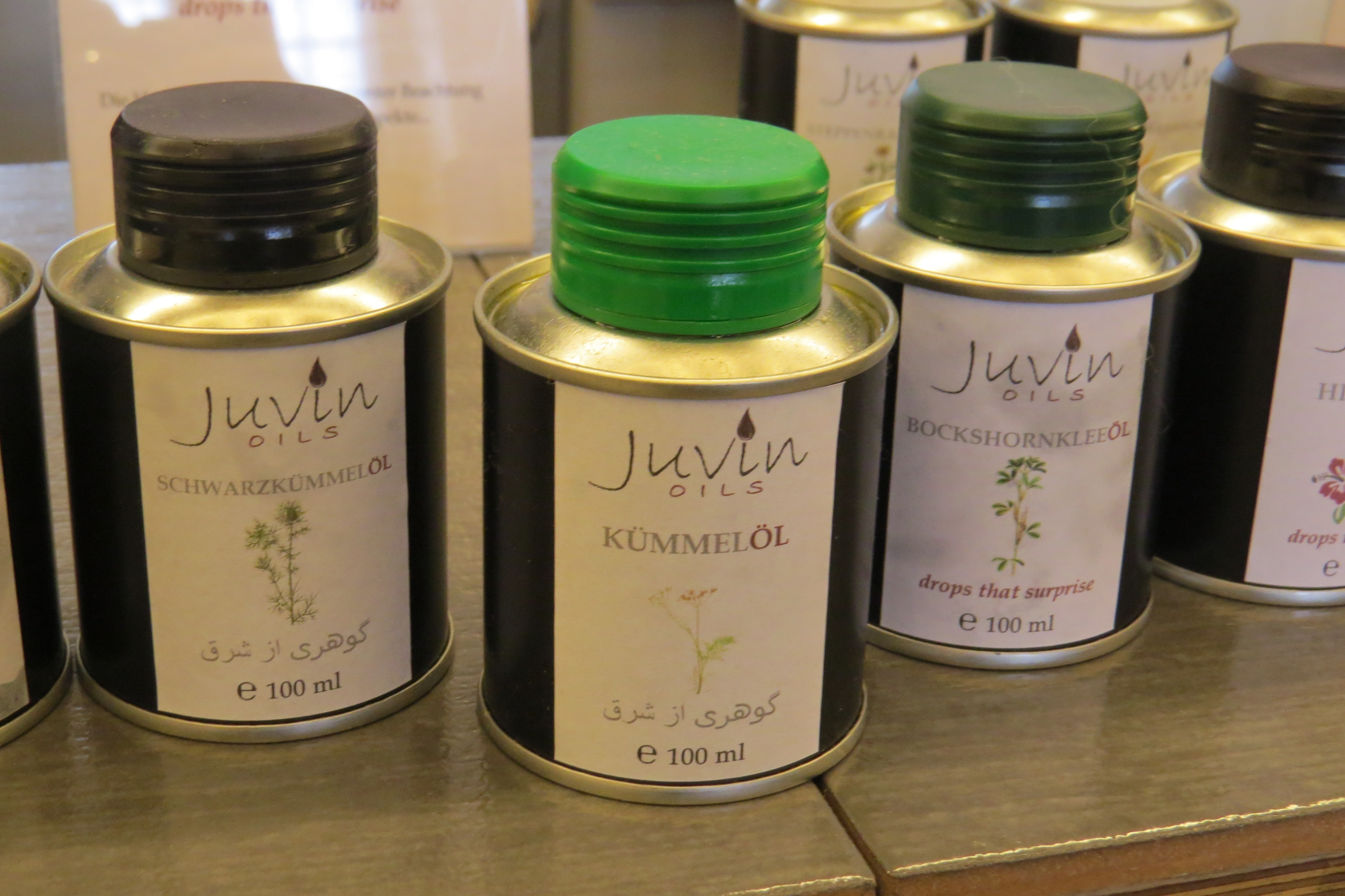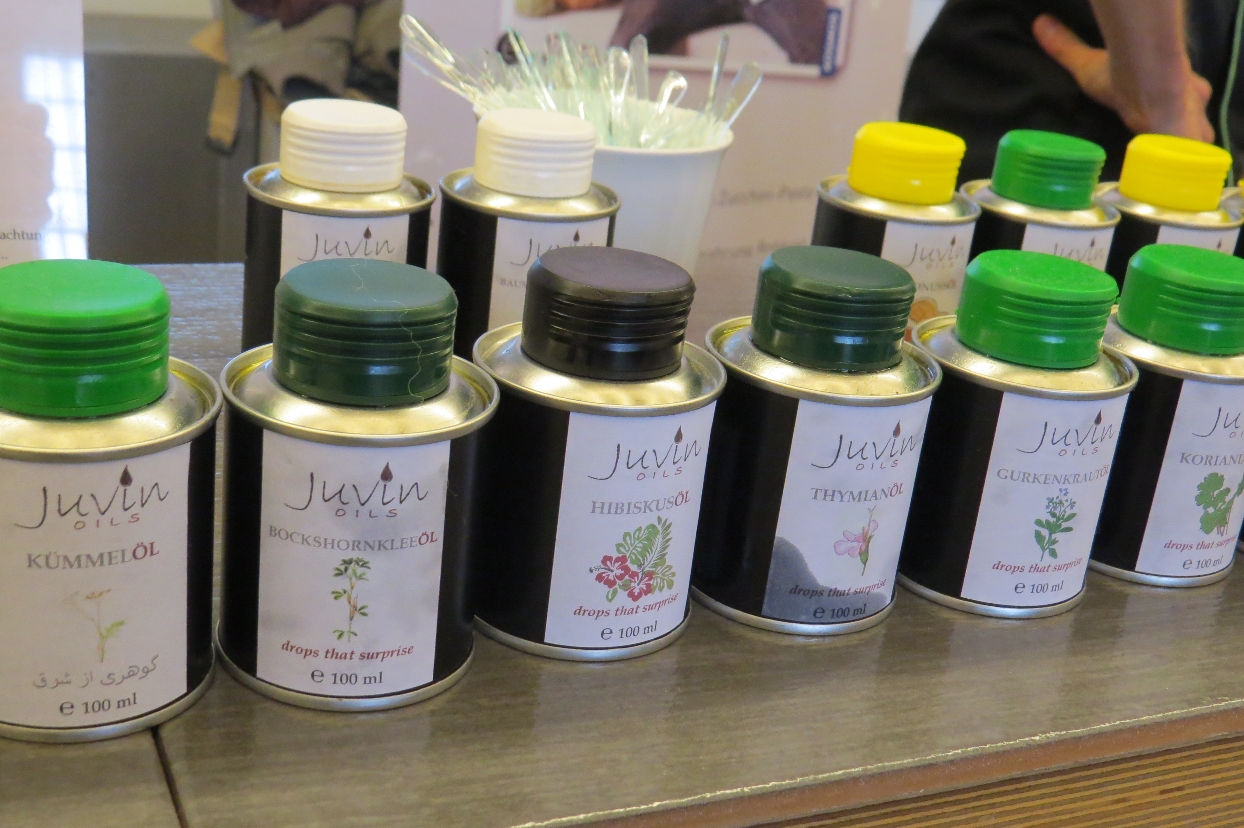 A few exhibition stands away was Juvin Oils, a company specializing in unusual and rare edible oils. Juvin was founded in April 2014; they import their oils from Iran and their range includes some 28 different varieties. Although Juvin sells well-known and commonly available oils like olive, walnut, peanut, hazelnut, apricot kernel, sweet almond and so on, I was intrigued by their more unusual variants – the line-up also features cinnamon, chamomile, cumin, thyme, basil, coriander, clove, cottonwool seed and coffee oil!