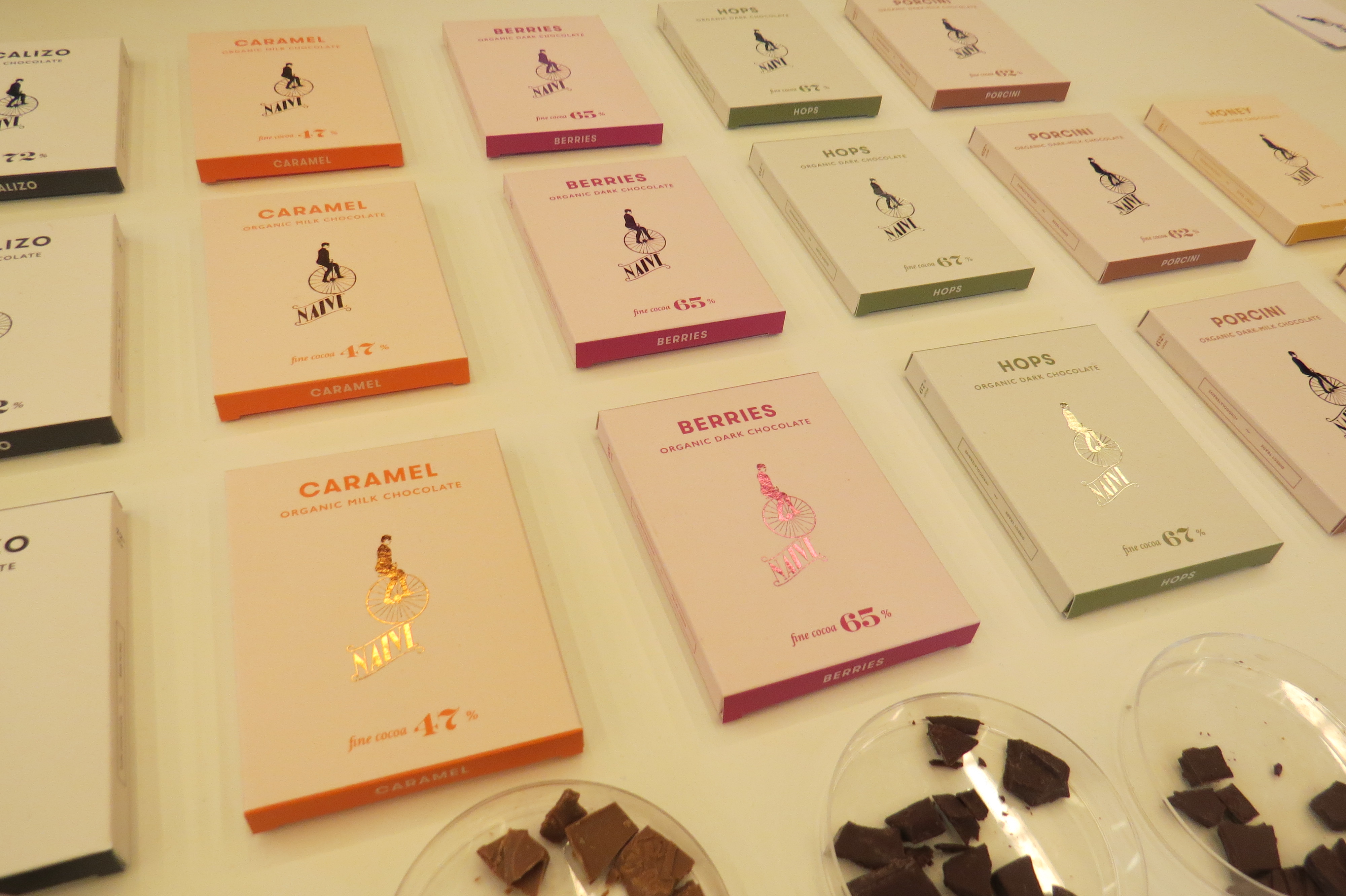 I forgot to take a picture of the Mulate chocolates – see above for a pic of the Naive collection. Naive is also pretty unusual: the line-up includes a 67% dark chocolate bar with forest honey, 54% dark milk chocolate, 67% dark chocolate with porcini mushrooms, 65% dark chocolate with berries, 67% dark chocolate with hops and a 38% milk chocolate with salted caramel. In addition to regular limited editions.