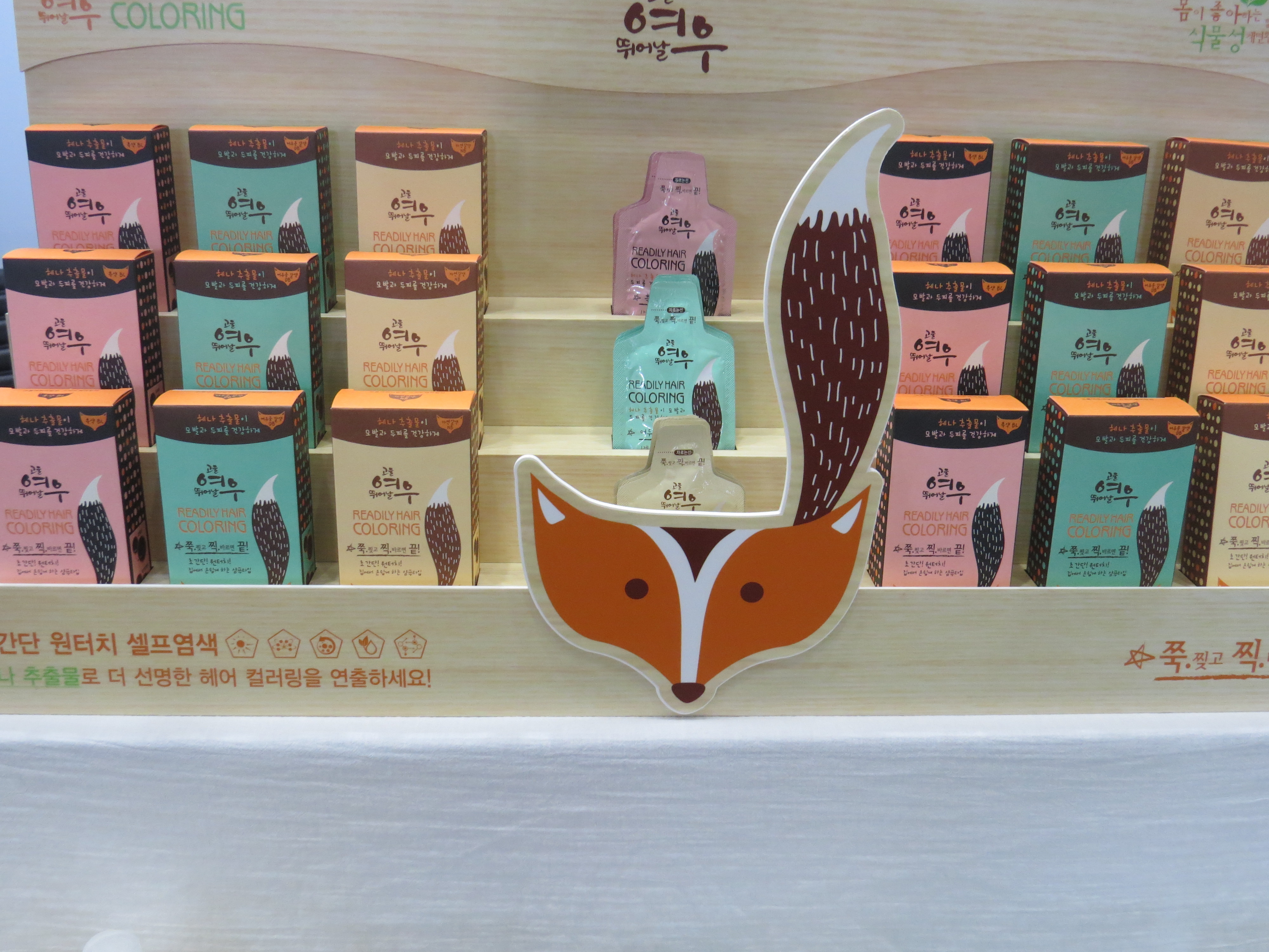 The anti-ageing Hongik Skin range is brand new; it will be launched in Korea later this month and is for more mature consumers. Skin care range Naexy targets women aged 20-30 years and Yeowoo is Hongik’s teenager brand. Yeowoo also includes a charming range of colourants: check out the fox design!!! The packaging is exquisite and I was particularly impressed by the fact that they also sell the colourant in sachets – these are dual sachets (if I understood this correctly), you cut them open, squeeze out both creams (the colourant cream and the developer) and mix them together in their hand. Ingenious.