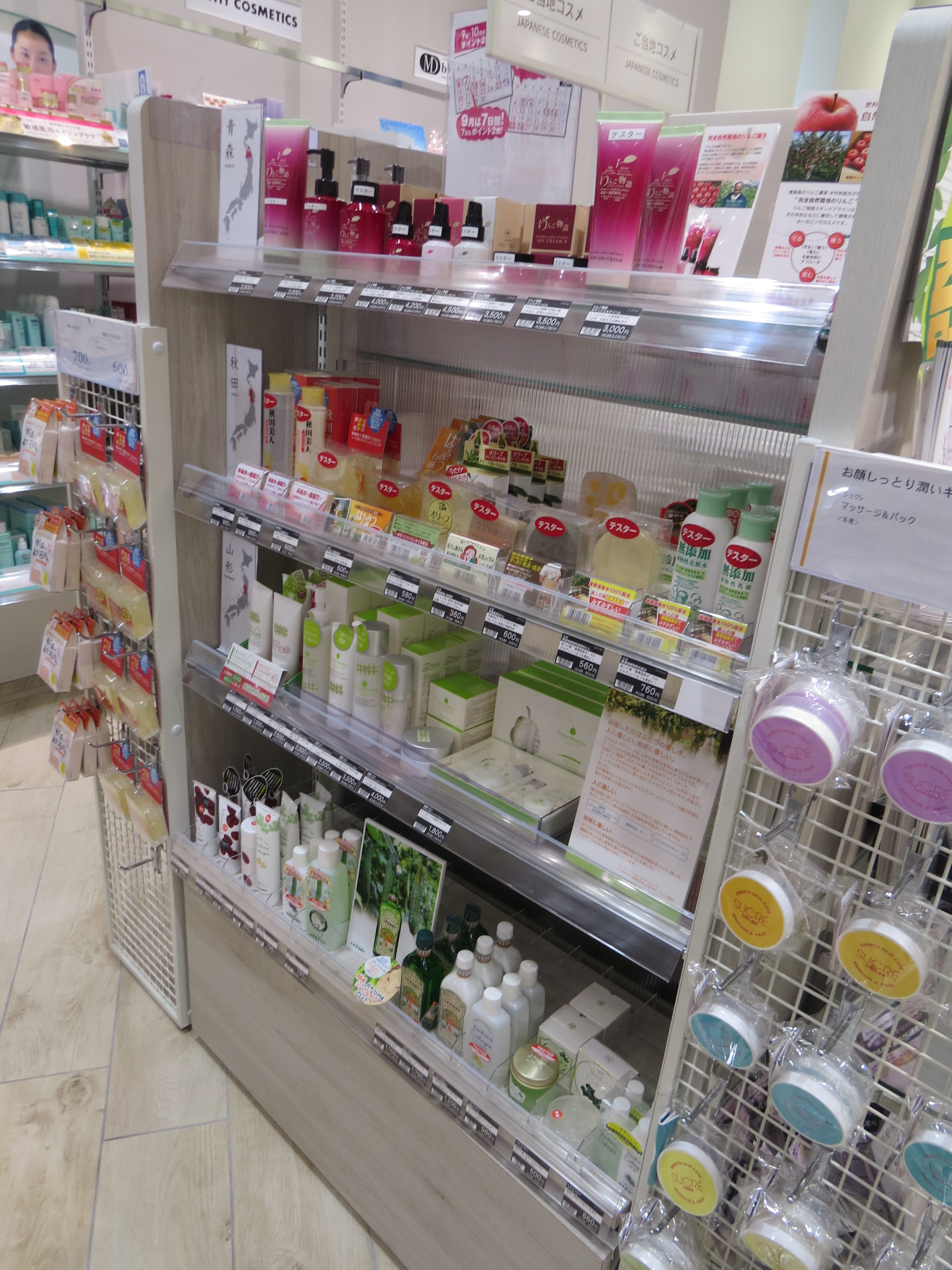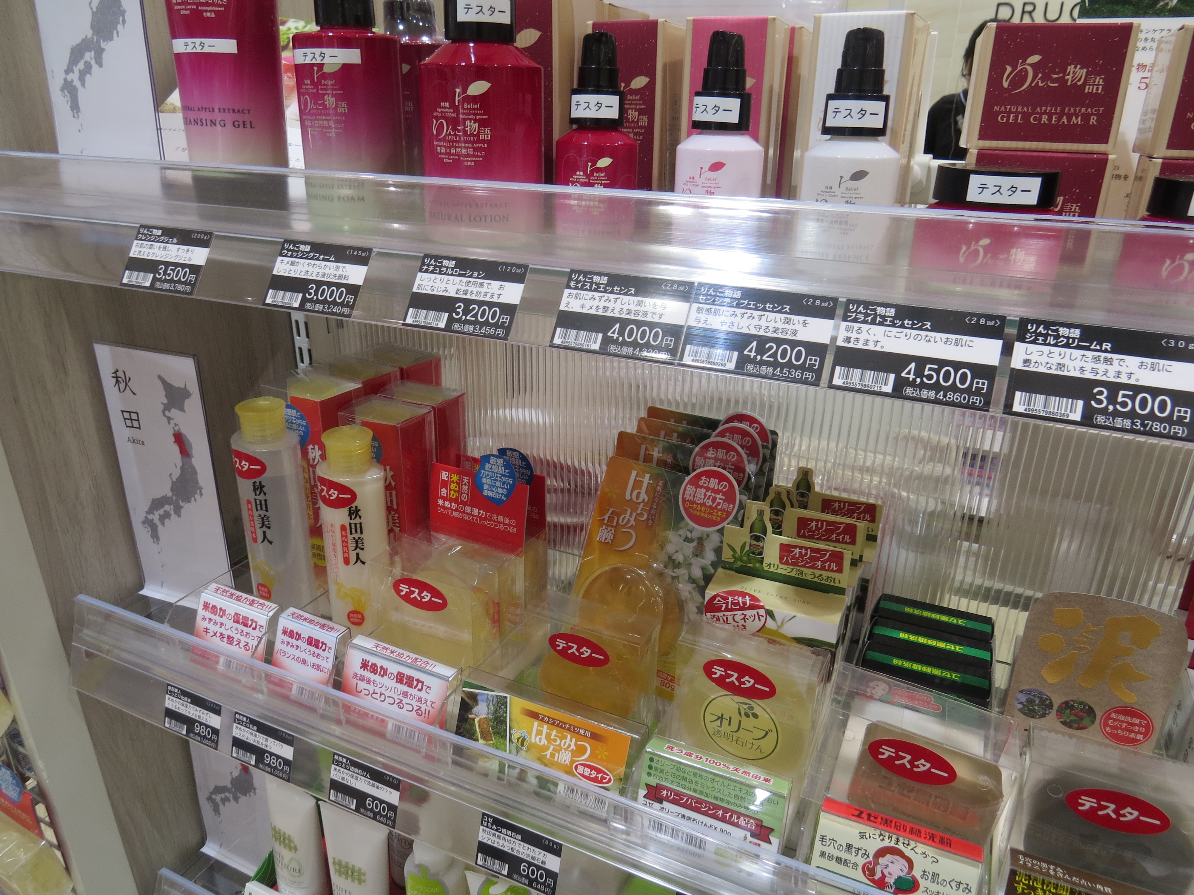 They are displayed near the cashier area and are clearly flagged up as “made in Japan”; there are also a couple of strategic “tax-free shop” signs. On each shelf you have a little poster with a map of Japan, the name of the province and the ingredient that this province is most famous for: Aomori, for example, is known for apples, Akita for rice, Niigata for sake, Yamagata for pears, Okayama for olives, Okinawa for camellia seed oil….