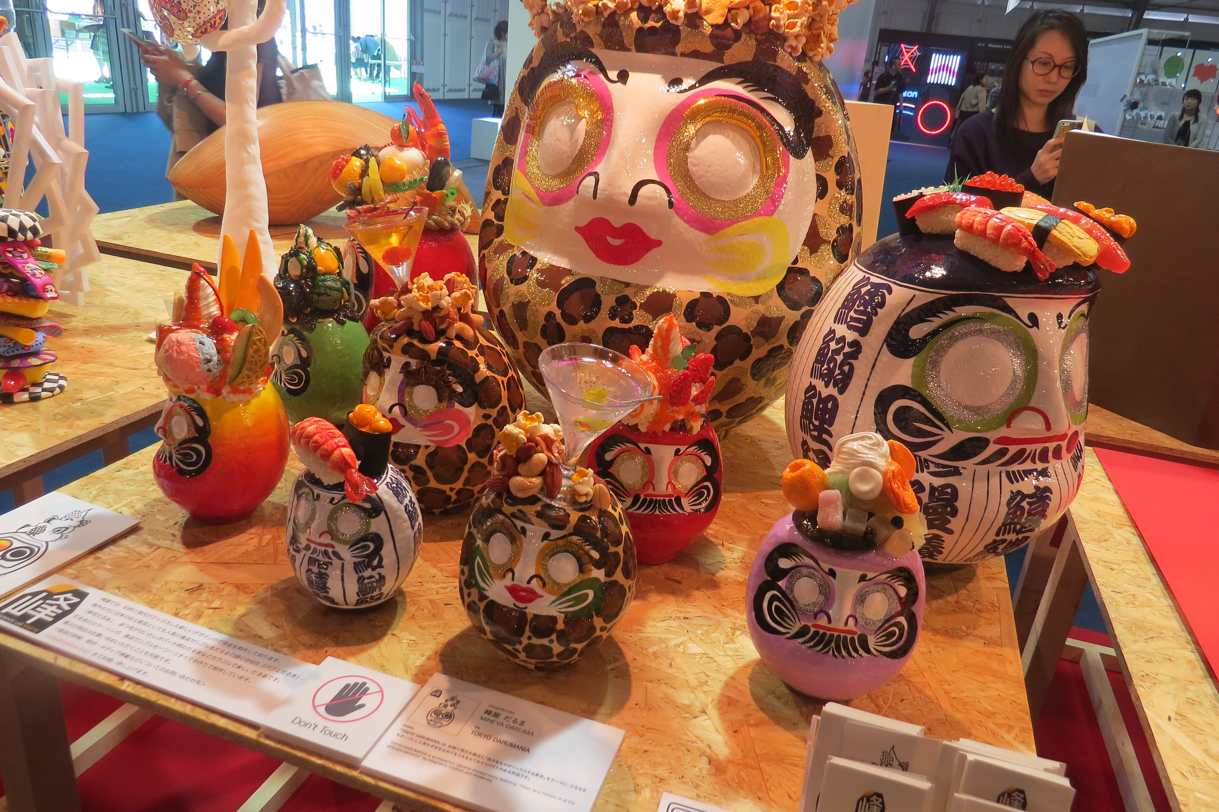 My TDW tour started in the main Creative Life tent. On the right hand side next to the entrance was the 100 Creators Exhibition: a sort of table-top show for new designers. Each artist had 1 sq m to present his or her work. I liked Tokyo Darumania, a display of Tokyo-inspired Daruma heads – Daruma are traditional Japanese good-luck dolls – which featured dolls decorated with a variety of foods, including traditional delicacies like sushi and sashimi and modern-day favourites like fries or gelato.