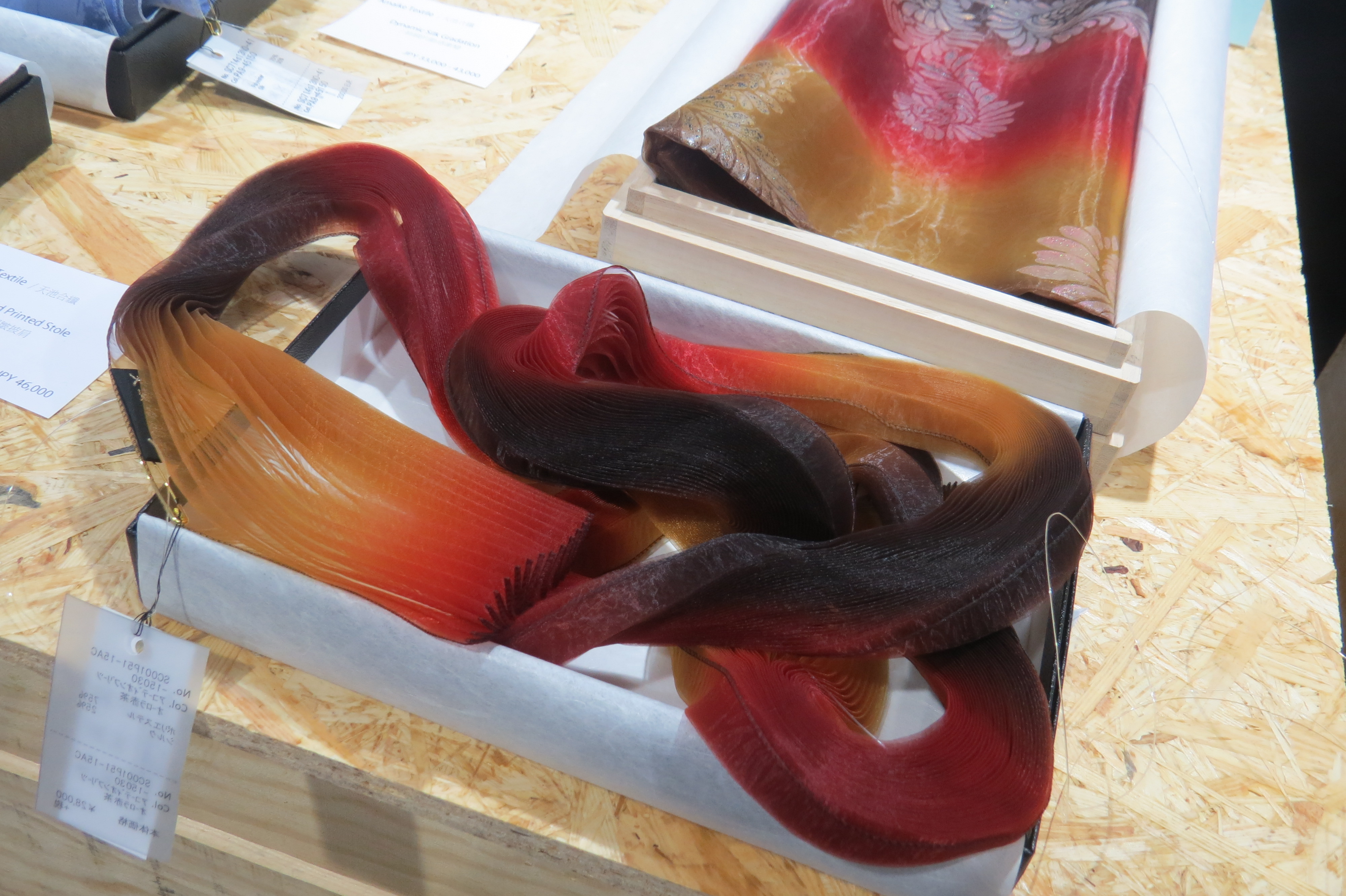Ikeuchi Organic from Imabari was founded in 1953 and produces environmentally friendly cotton towels while Aoki Kogei manufactures silk products in Kiryu province: they showed silk stoles with different threads and weaves. Amaike Textile from Nanao makes 27-micro polyester organza thread which is described as the lightest and thinnest fabric in the world – I immediately coveted their beautiful slinky printed scarf! – and Nuno Anuene from Kobe sells jacquard fabric items like coasters and little square boxes and fabrics.