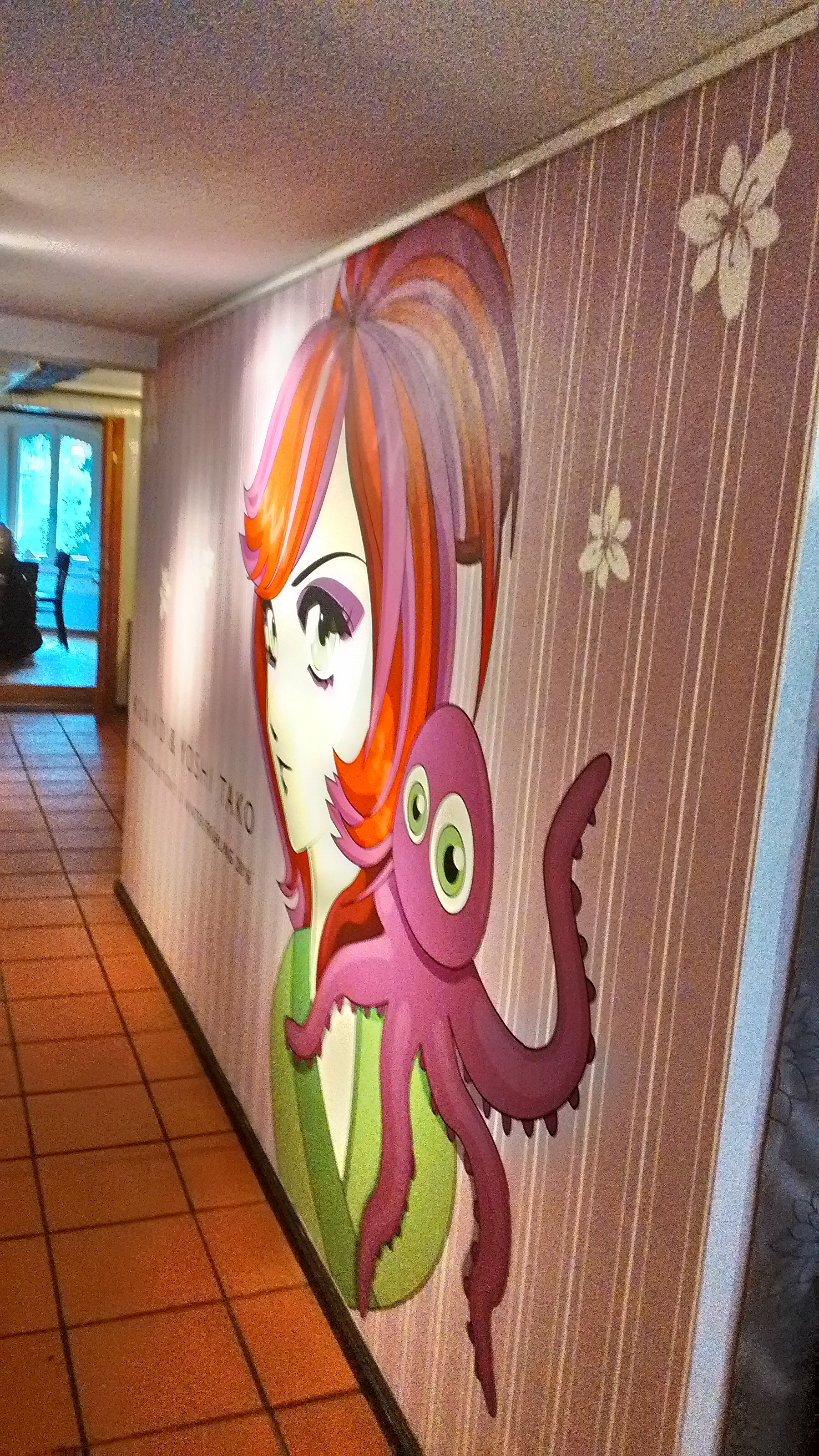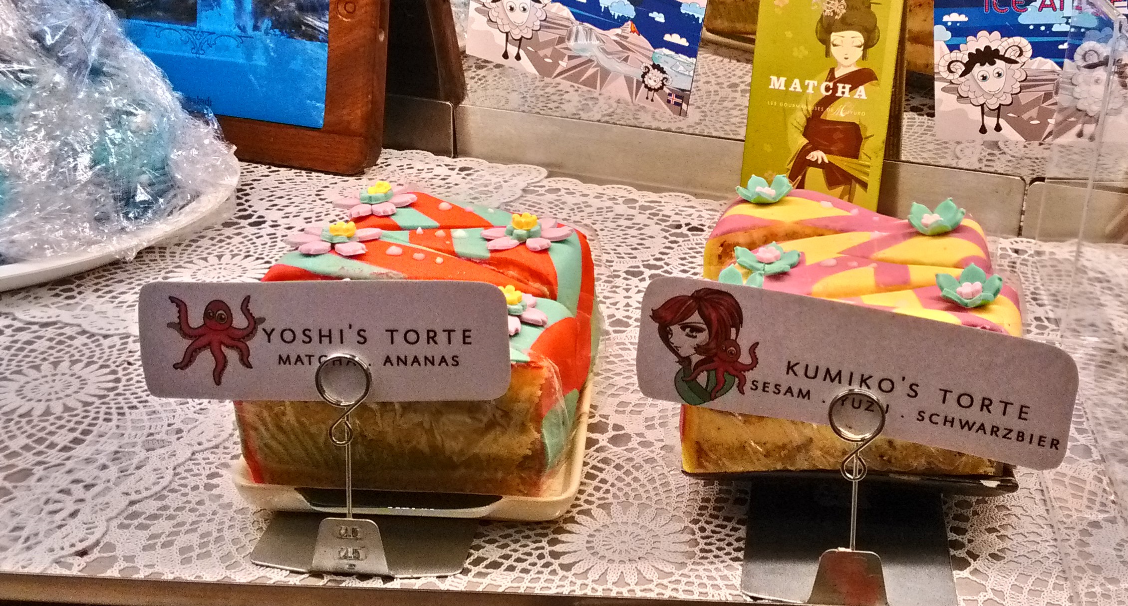 This spring/summer 2016 collection is different: Sara has created a new anime character – Miyuko’s sister Kumiko and her favourite pet, the kraken Yoshi Tao! The two main cake creations were Kumiko’s Torte (a delicious combination of light sponge cake with sesame seeds, a zesty yuzu cream and accents of black beer) and Yoshi’s Torte (matcha sponge cake with a filling of pineapple cream).