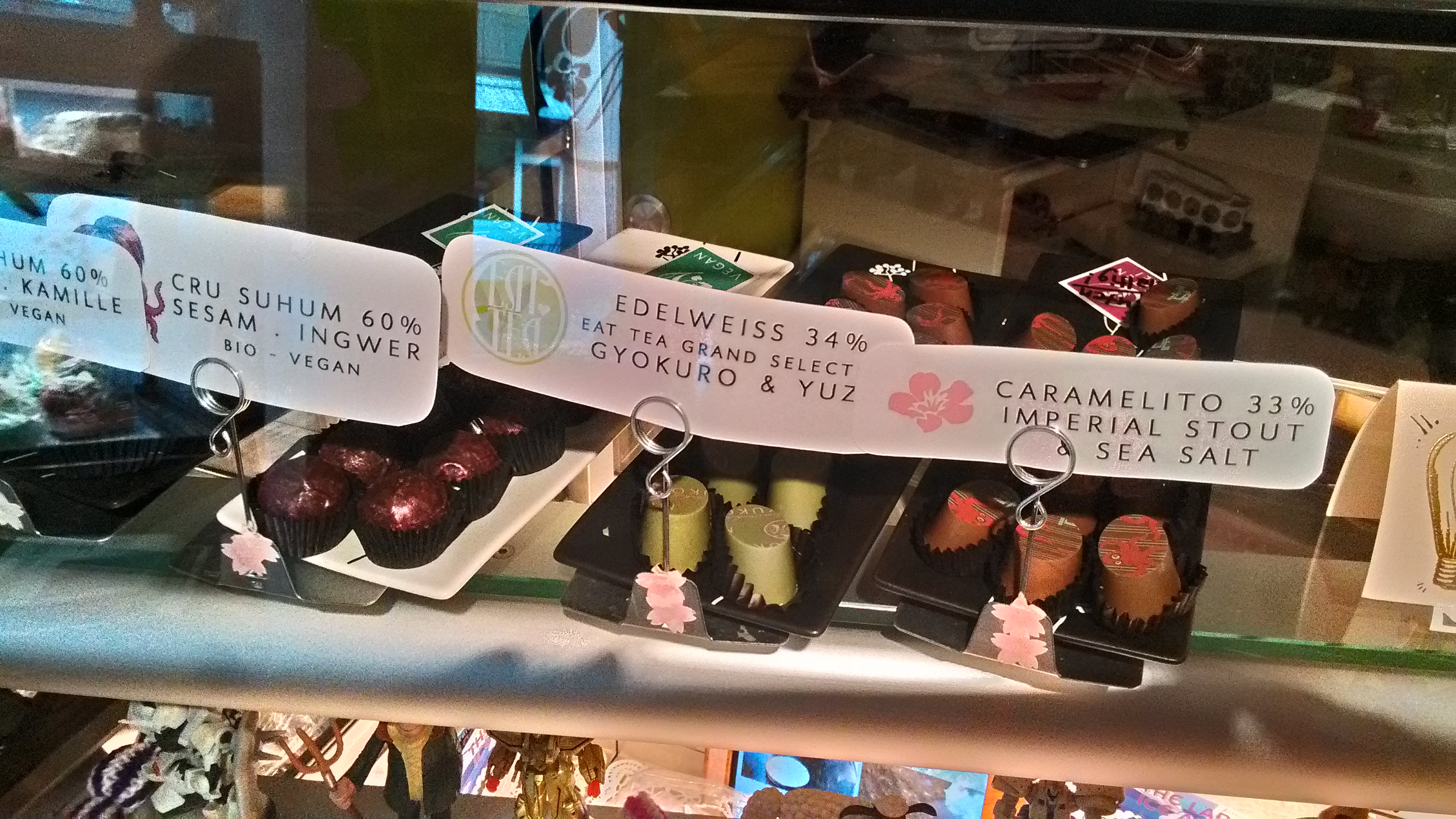 As always, the collection included several praline creations which reflected the key ingredients used in the cakes – I tried the Edelweiss 34% (gyokuro green tea & yuzu) and Caramelito 34%: Imperial Stour & sea salt – an intriguing and rather delicious combination! There were also two 60% dark chocolate pralines (sesame & ginger and pineapple & chamomile) and five matching bar chocolates. I wanted to buy the stout & sea salt chocolate but was in such a hurry to catch my flight that I forgot. What a pity!