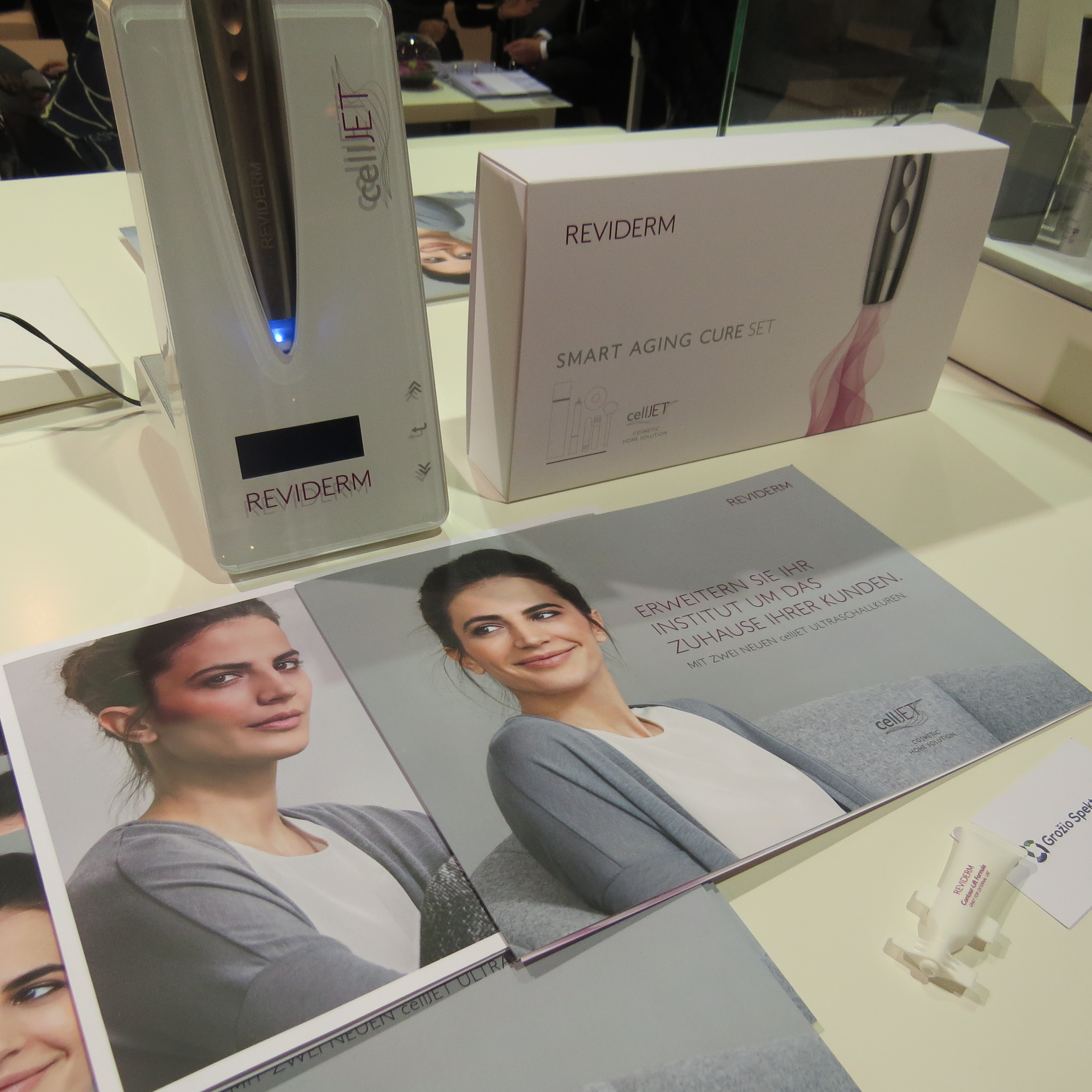 The company’s latest launches include the Reviderm SkinNeedler: a slender micro-needling tool which is described as being much gentler and more effective than traditional dermo rollers. Another recent Reviderm innovation at the trade show was CellJet, an ultrasound treatment tool which can be used at home. It is part of a three-pronged anti-ageing treatment, the “Smart Ageing Cure”. First you receive a professional pre-treatment by a Reviderm-trained beautician, then you use the 14-Days Home Cure (a set which contains a pre-programmed CellJet pen and highly concentrated vitamin C spheres) and after two weeks, you return to the salon for a final treatment.