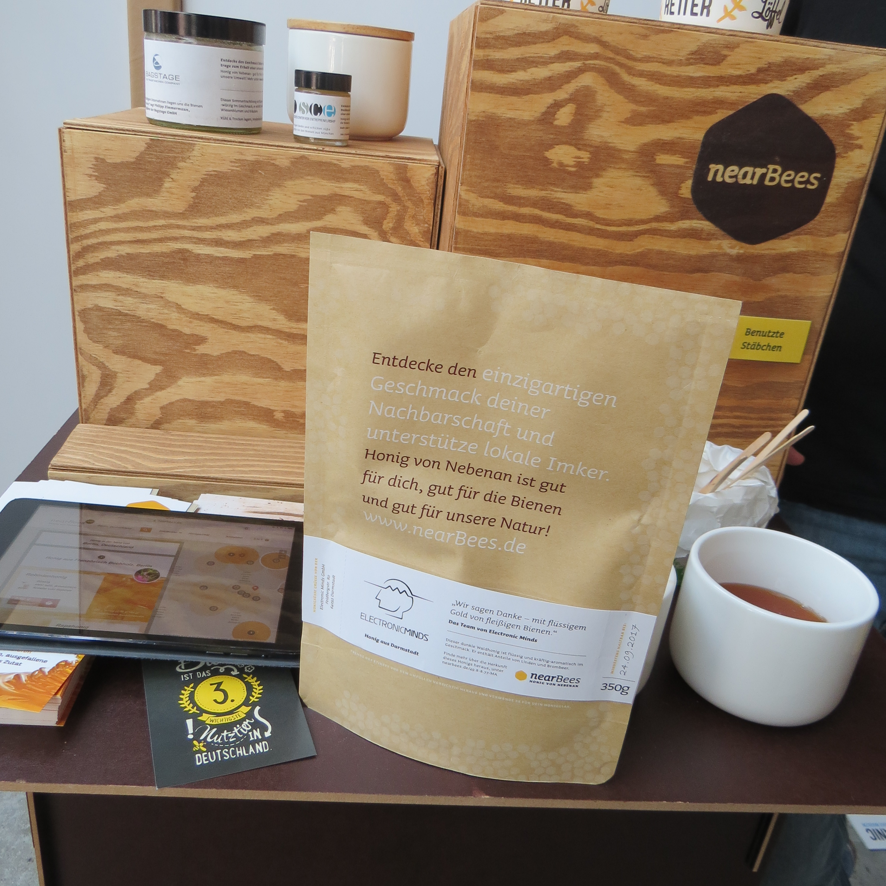 One of Startnext’s successful projects is Nearbees from Munich. Nearbees is an association/network for hobby beekeepers and urban beekeepers: the company has developed a very cool way of dispatching the honey – rather than using glass jars, Nearbees ships the honey in large brown envelopes. You snip the envelope open and decant the honey into the container of your choice. It’s easy to send the honey via post and Nearbees also operates a website which shows you where the bee swarms that produced the honey you just bought have harvested the nectar.