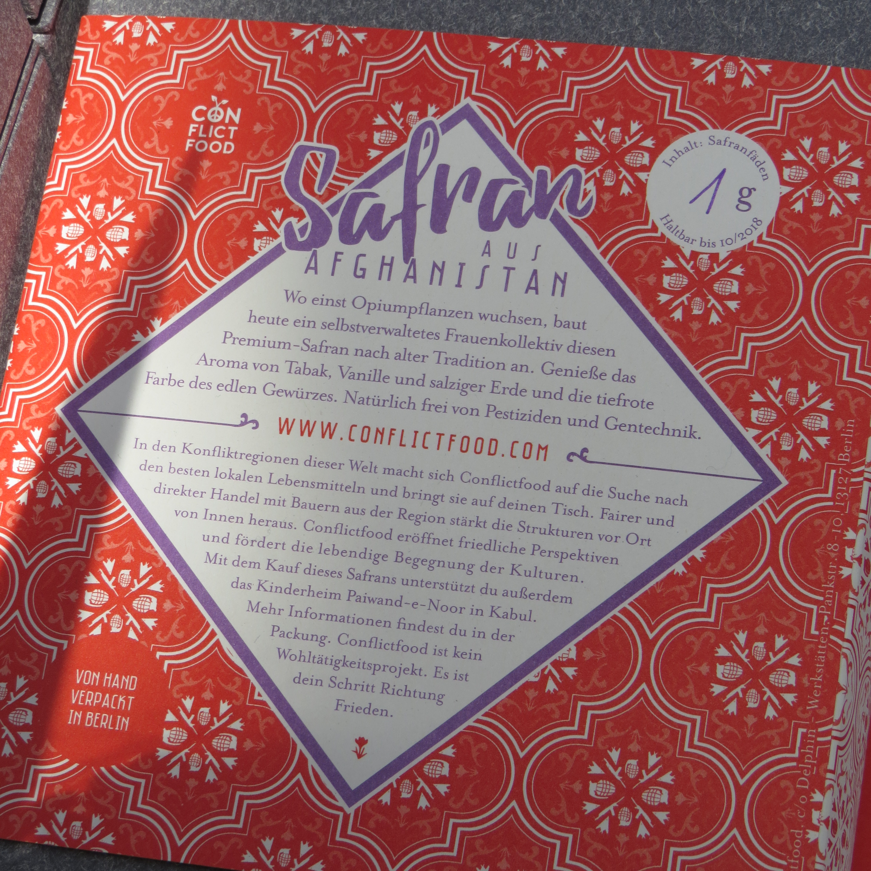 The first Conflictfood product, which was launched at Next Organic, is saffron cultivated and harvested by a women’s collective in the small village of Shakiban near Herat in Western Afghanistan. The boxes you see in the picture also include a kind of newspaper which gives information about the current product (in this case, the saffron), introduces the people growing/manufacturing/harvesting it, offers articles about the local culture and the economy of the country/region in question – really interesting. The founders are planning to launch a new product from a different country every few months or so; I was told that the next product will be olive oil from Palestine.