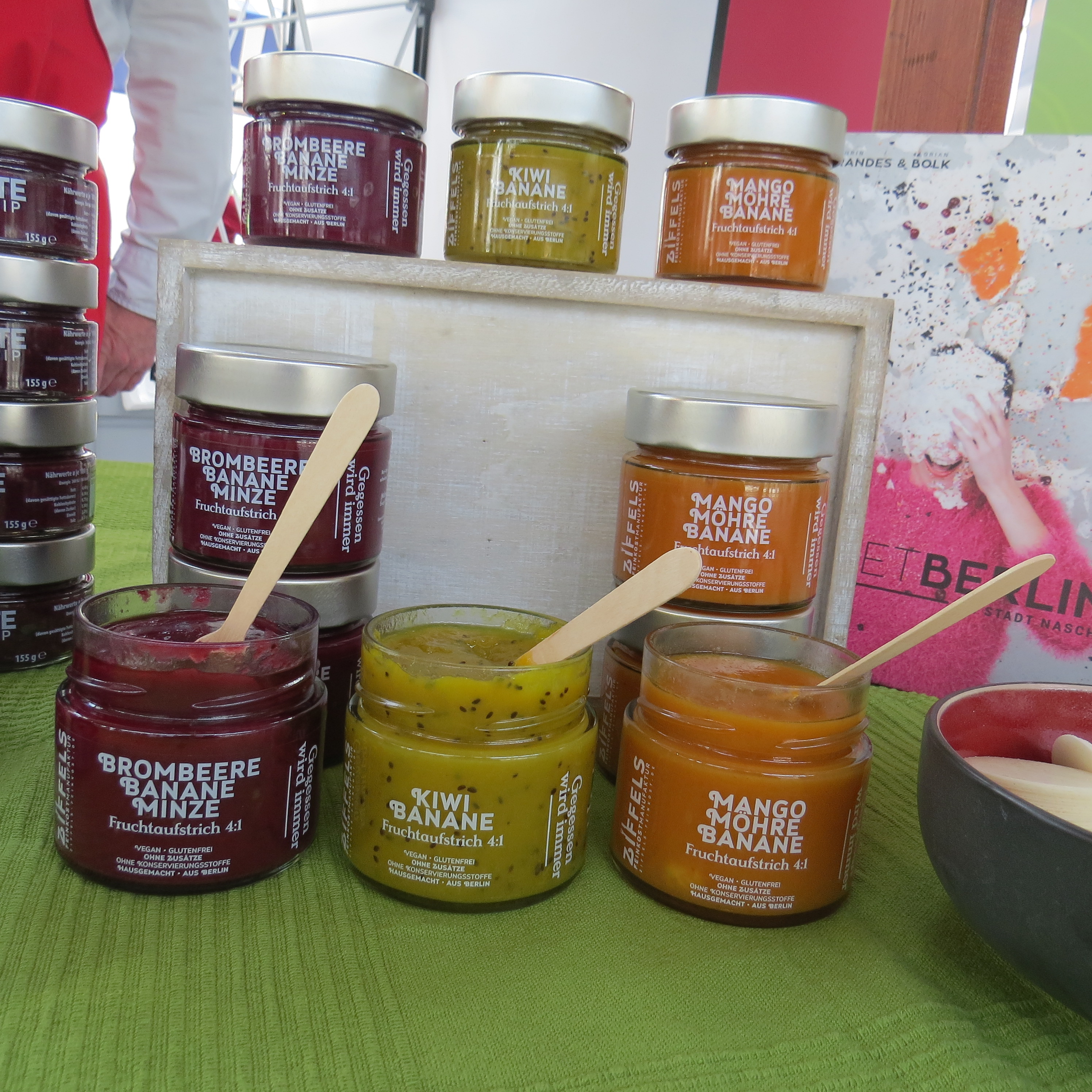 Ziffels Feinkostmanufaktur was founded in 2014; they produce chutney, pickles and other sweet and savoury spreads. I’m a huge chutney fan so I sampled several of their 13 variants – very delicious indeed, especially the tamarind & date chutney (I love tamarind!!!)! The products are all manufactured in Berlin and Ziffels’ most recent launch, in cooperation with Berlin-based online food store Gegessen wird immer, are three fruit-based jams – Blackberry, Banana & Mint, Kiwi Banana and Mango, Carrot & Banana – which are made with reclaimed bananas! In this case, reclaimed bananas are bananas which are so overripe that they can’t be sold in regular food retail any more – rescued bananas, if you will.