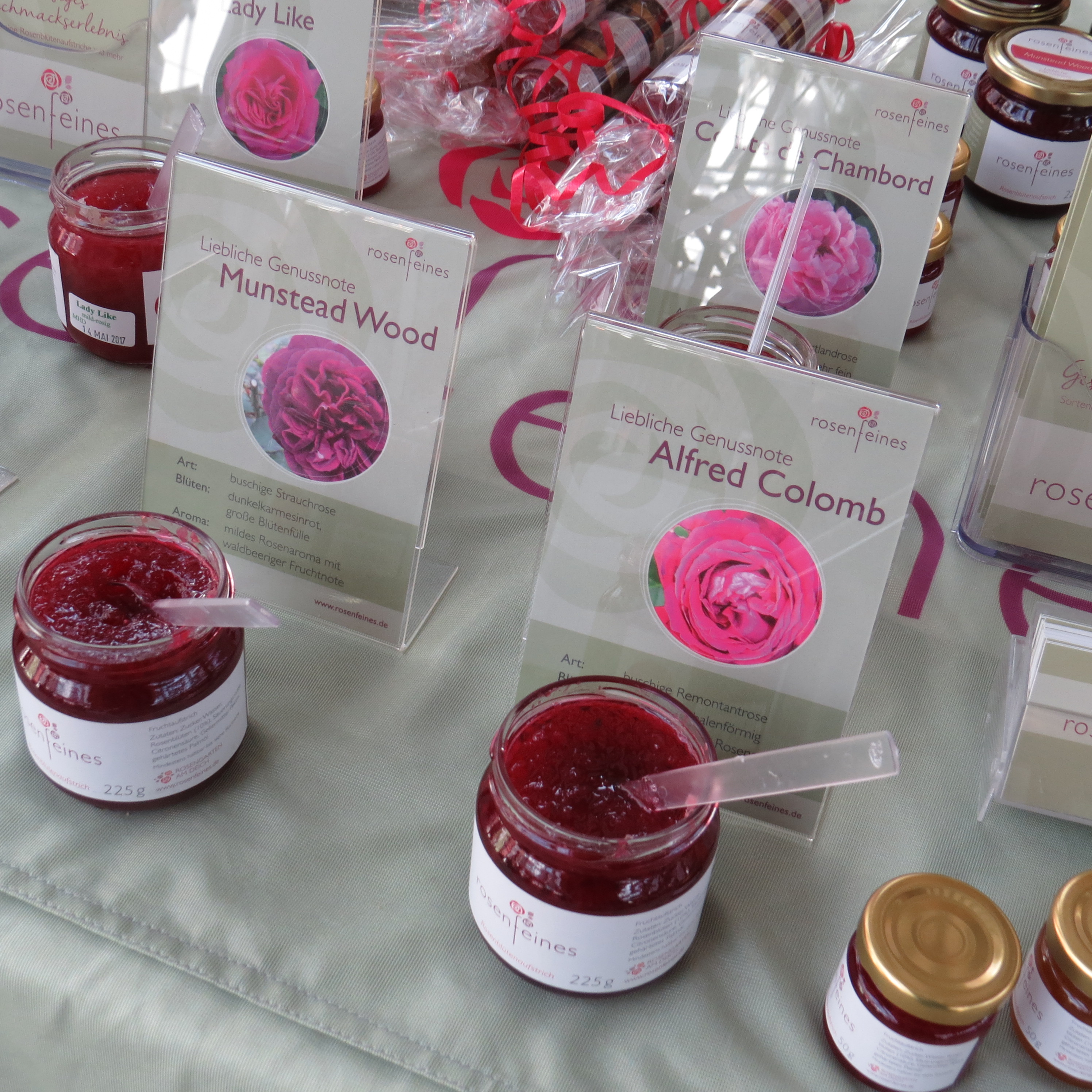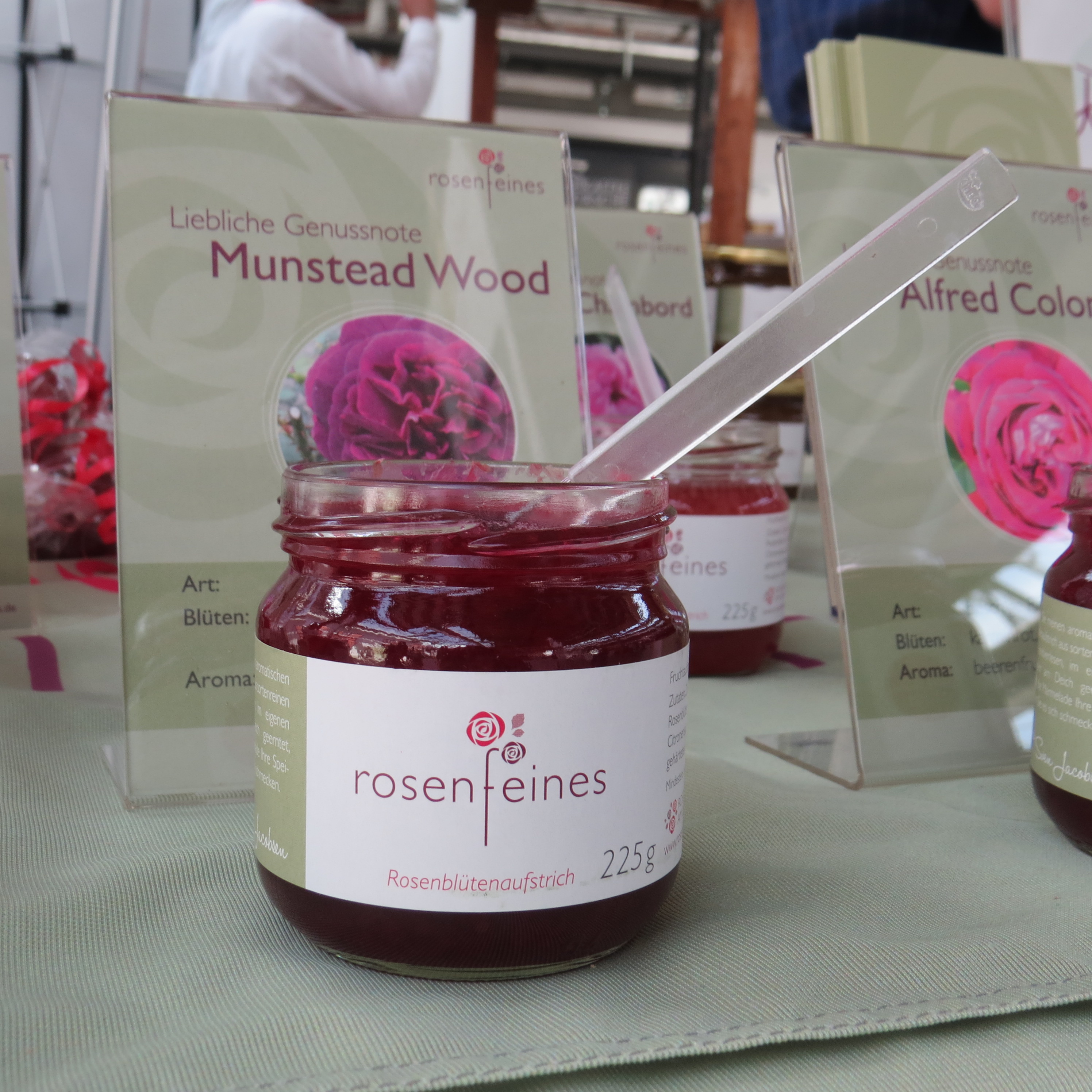 Founder Sven Jacobsen told me he cultivates some 700 rose bushes and over 100 rose varieties. And believe me, the rose jams really taste very different: the scale starts goes from a mild and fruity yellow rose gelée (Charles Austin) over delicate pink rose-scented jam (Gräfin Hardenberg) all the way to bright red, fragrant rose spreads which taste like rich, strong rose perfume (Rose de Resht – my favourite). Amazing. The Rosenfeines products are primarily sold online and through selected gourmet and delicatessen stores.