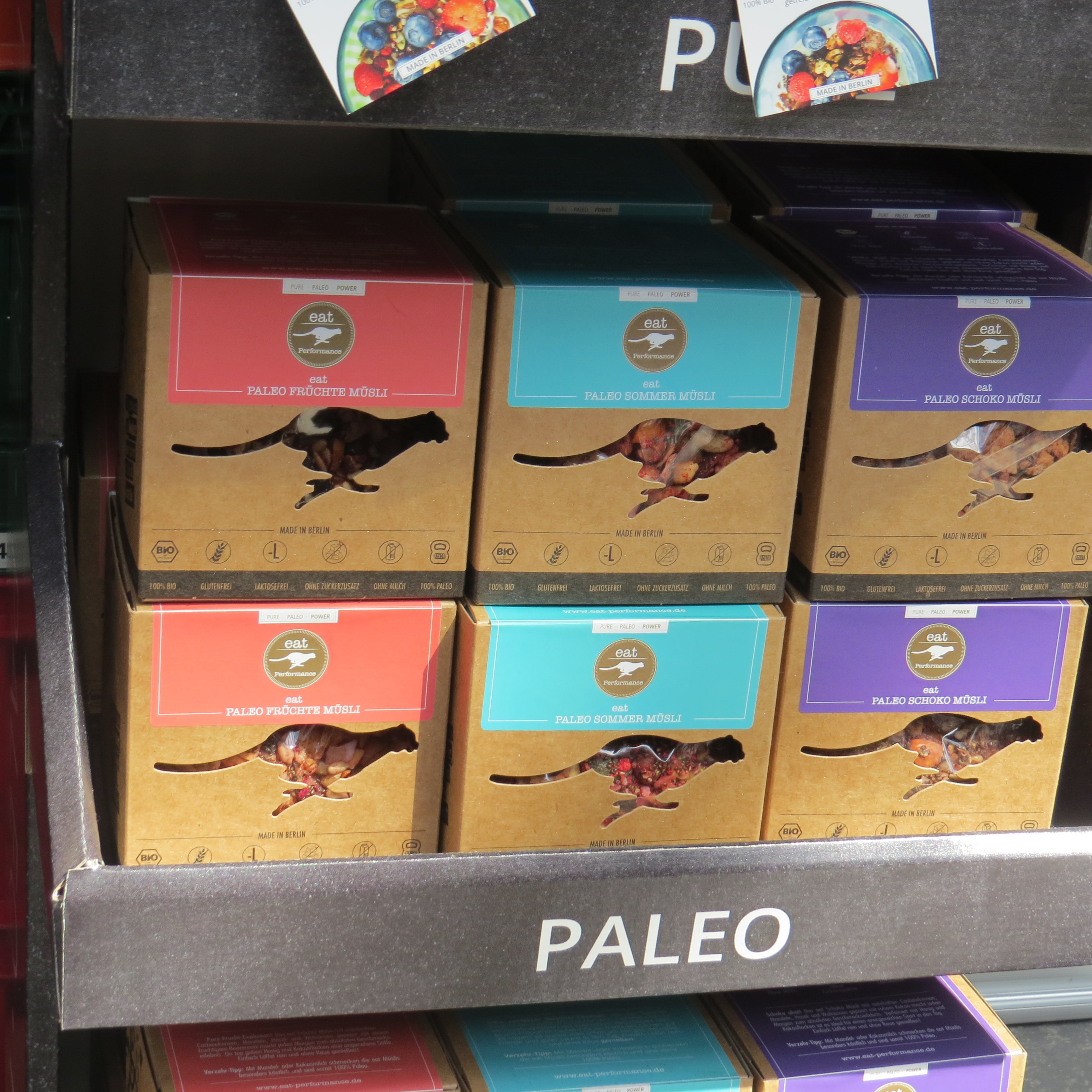 I had seen the dried fruit bars of Berlin-based manufacturer Eat Performance in-store but didn’t know that the company also produces Paleo muesli mixtures (available in to-go packs or larger sizes), Paleo cookies and Paleo bread baking mixtures. Very nice! Eat Performance was founded in 2013 which probably makes them one of the first German Paleo food companies. Two other Paleo exhibitors at the show were Organic Workout from Karlsruhe (they produce Paleo beef jerky and Paleo bread baking mixtures) and Die Kraft des Urstromtals (from Berlin) which manufacture sweet and savoury Paleo bars.