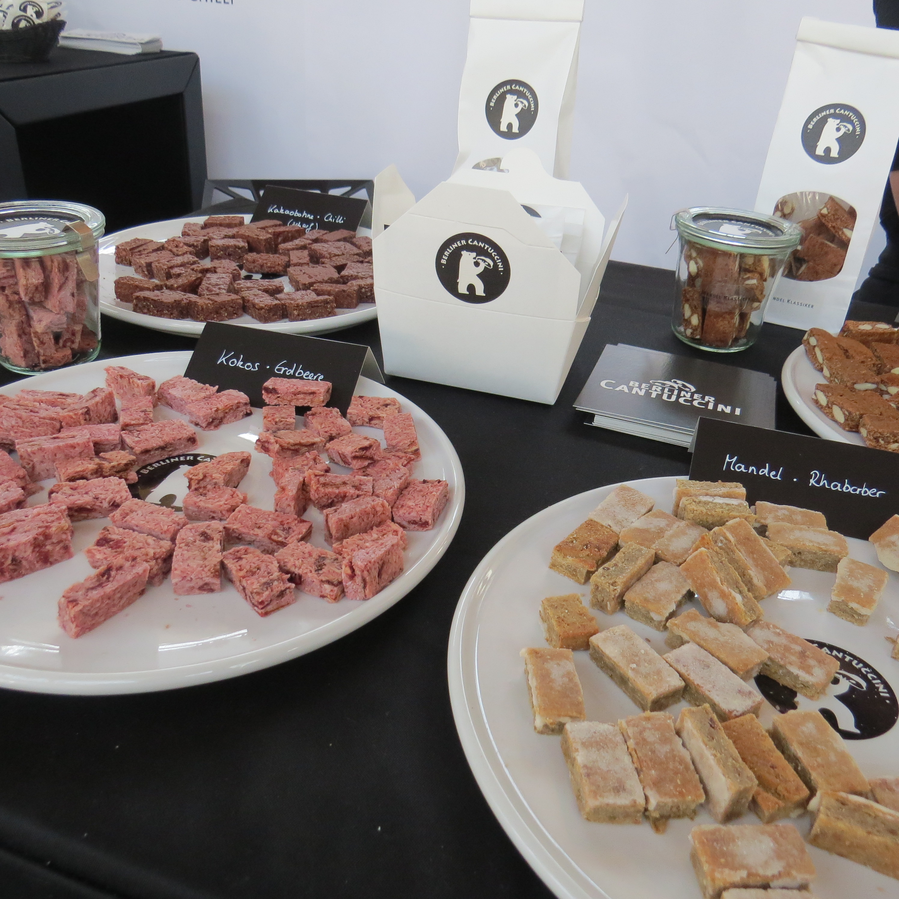 And returning to Berlin-based manufacturers: I liked the unusual cantuccini from artisan manufacturer Berliner Cantuccini. Cantuccini are crunchy almond cookies (a bit like biscotti) and they are originally from Italy. Berliner Cantuccini, however, is taking the cantuccini concept to new levels: in addition to the classic almond cantuccini, the company also offers seasonal and savory varieties: roquefort cheese & fig, for example, pine nut & parmesan, cashew nut & olive or pistachio & wild garlic. The sweet seasonal variants include mouth-watering almond-rhubarb, apple tart, coconut & strawberry and pecan nut & vanilla but the brand also sells cantuccini made with hemp seed & pink pepper or peanut & chilli. You can also commission your very own cantuccini variety! Berliner Cantuccini is still a very young company; they were founded in 2015 and in early 2016, they opened their bakery and store in Prenzlauer Berg.