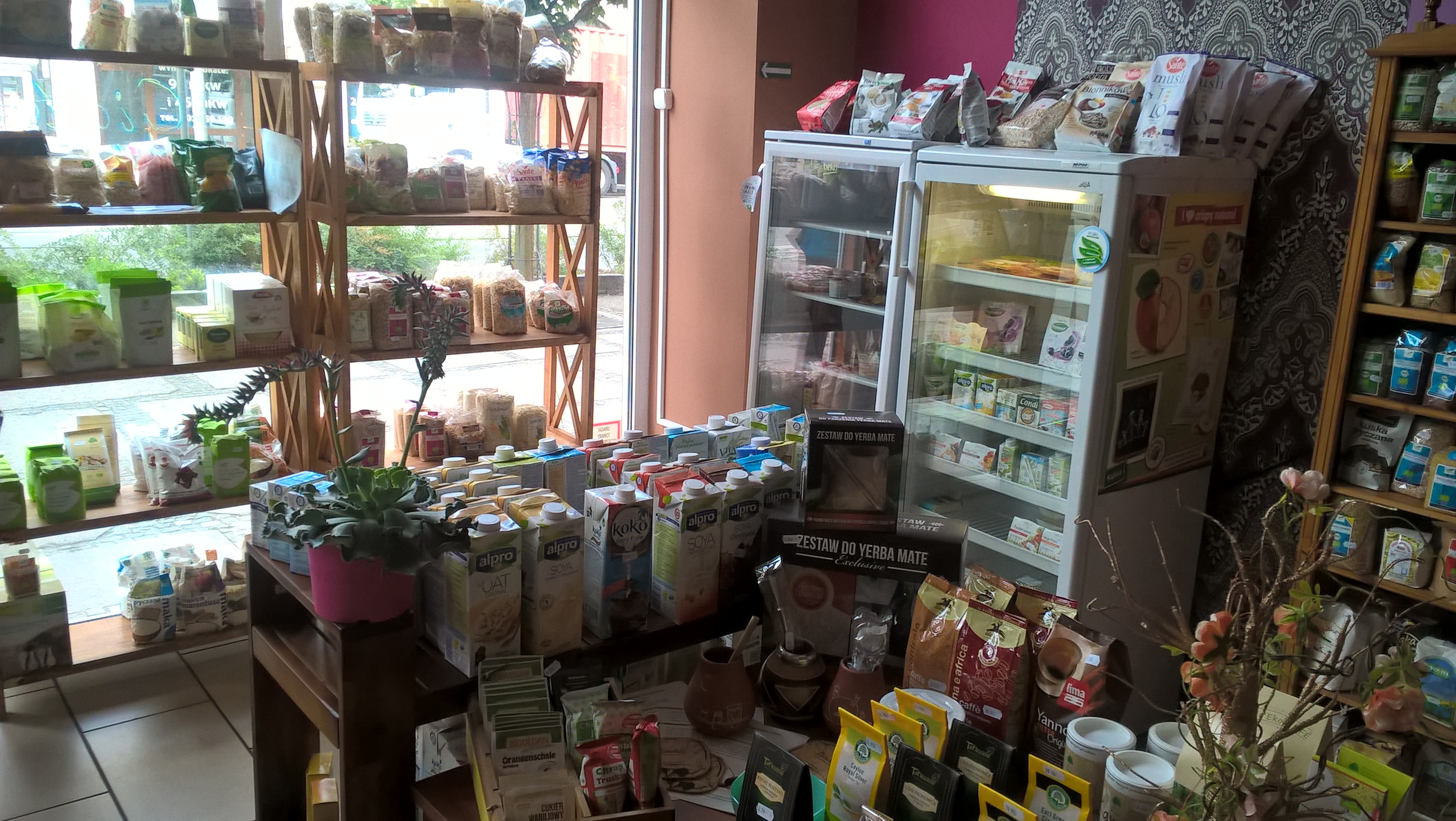 Vegananda is located very centrally on Krzywoustego street. Once you enter the store you standing in the middle of the retail area: Vegananda sells Vegan food products from a range of European and Polish brands, including spices, teas and Superfoods, flour substitutes (I bought a bag of Topinambur flour because it looked interesting!), sugar substitutes (birch sugar, coconut sugar) and milk alternatives.