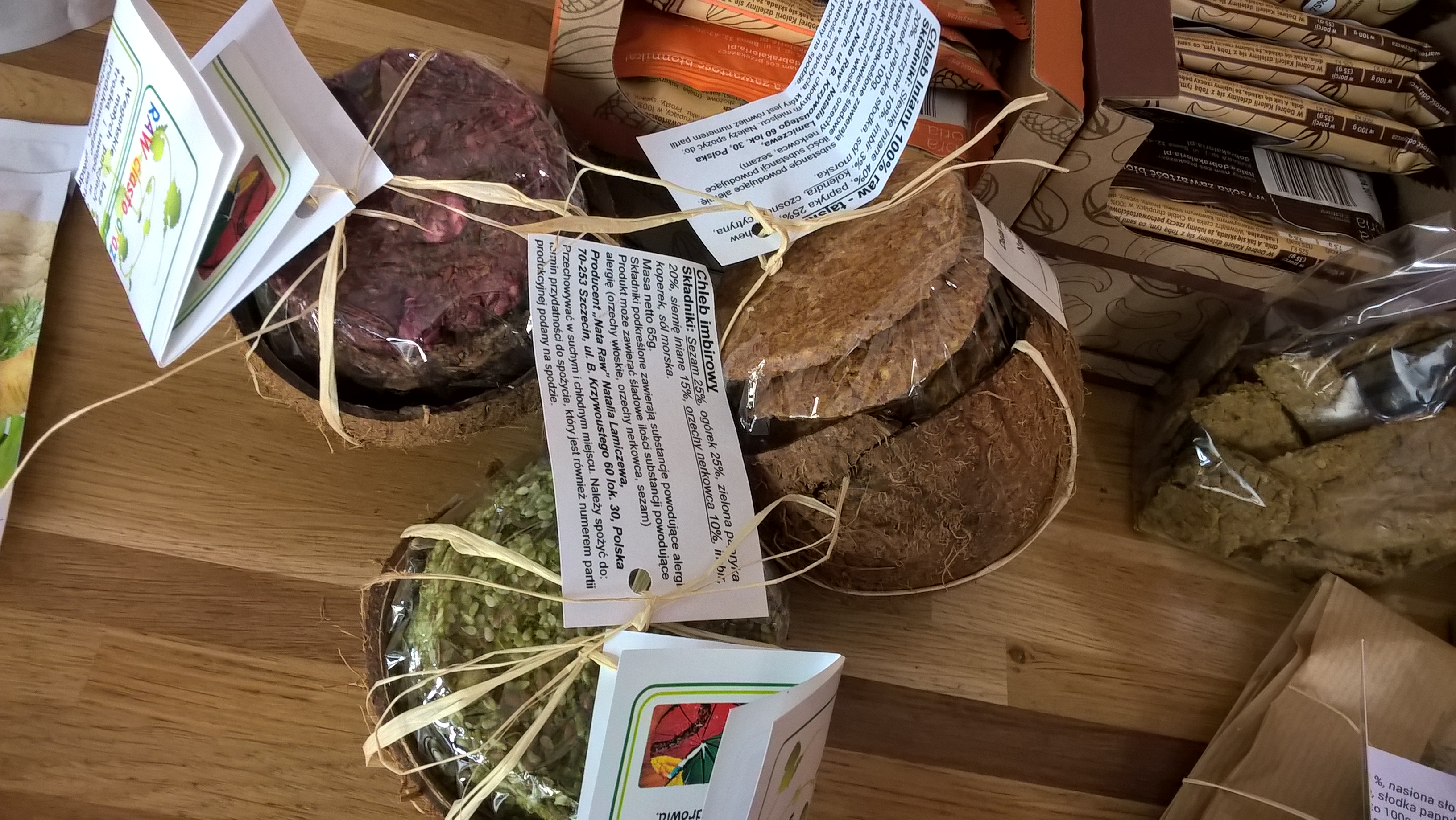 There was also confectionery (including Polish chocolate brand Cocoa which I love! And this is coming from someone who isn’t even a fan of raw chocolate….), noodles and rice, a special display with hemp products (including hemp lollies!); Vegan spreads and jams and even some raw foods – check out the three differently coloured raw bread variants on the pic below (round slices packaged in half a coconut!).