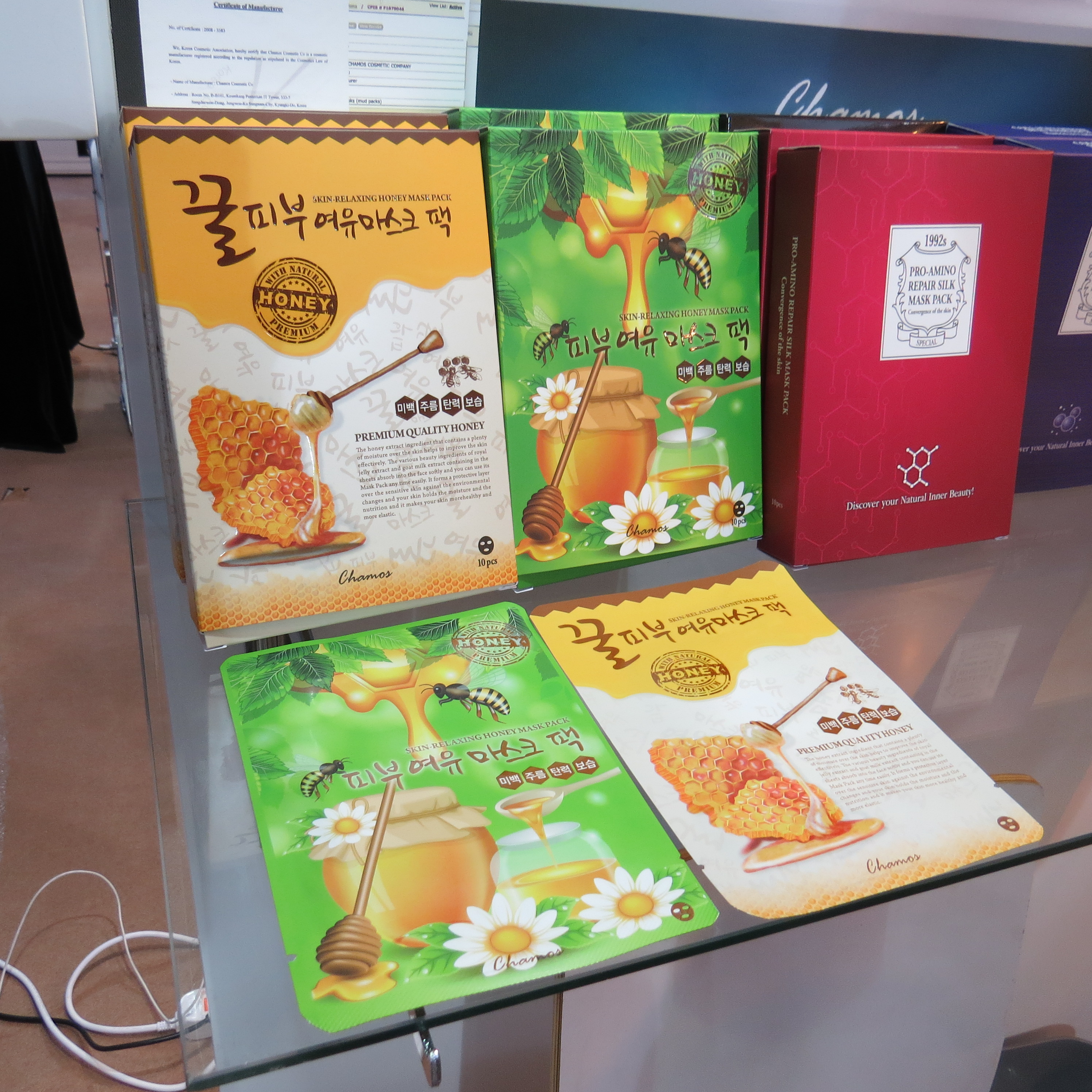 I was also happy to see an old favourite: Korean skin care manufacturer Chamos. I like Chamos’s Acaci skin care products (one of my very first K-Beauty purchases all those years ago – in a Sasa store in Singapore, to be exact – was the Acaci Trouble Spot Lotion.) Since then, I have seen Chamos at various C&T trade shows, most recently at Cosmoprof Bologna this spring. Amongst Chamos’ new launches is an Acaci Snail Repair gift set and two luscious-looking new honey sheet masks (see pic below). The brand’s products are available in most Asian countries these days and I was told that Chamos has just started to distribute its products in the US. Perhaps Acaci will also be available in Germany one day?
