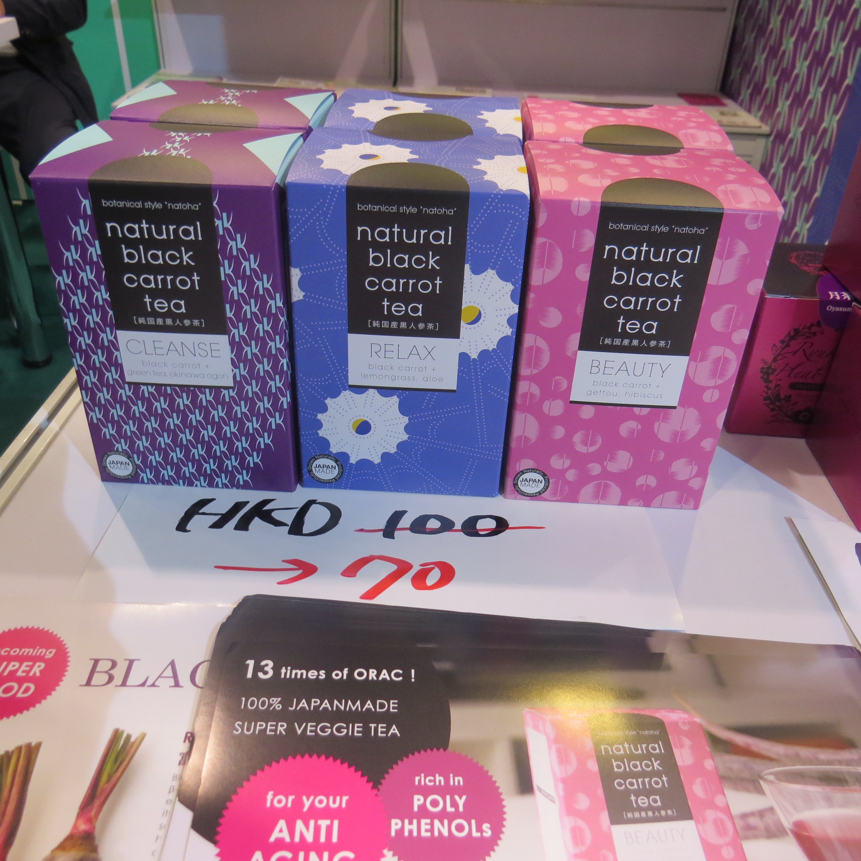 There was another non-beauty company that I really liked: Natoha is a tea brand from Okinawa, Japan’s most Southern island. The brand was launched earlier this year and their three teas are all made with regional ingredients: the main ingredient is black carrot (one of the oldest carrot species in existence) which is grown right there in Okinawa. Black carrots are said to contain a lot of anti-oxidants and polyphenols (much more so than “ordinary” orange carrots) so they are considered a very healthy vegetable. In each Natoha tea variant, the carrot is combined with other ingredients: Love contains hibiscus and shell ginger, Relax contains lemongrass and aloe and Cleanse has green tea and turmeric. I tried all three teas and my favourite, I think, was Relax. Although Love also tasted really good. Anyway, since its brand launch Natoha has come in for quite a bit of press attention – mostly from the Japanese women’s, lifestyle and fashion media – and the company’s teas are sold in, for example, organic perfumery Beauty Library in Omotesando, Tokyo.