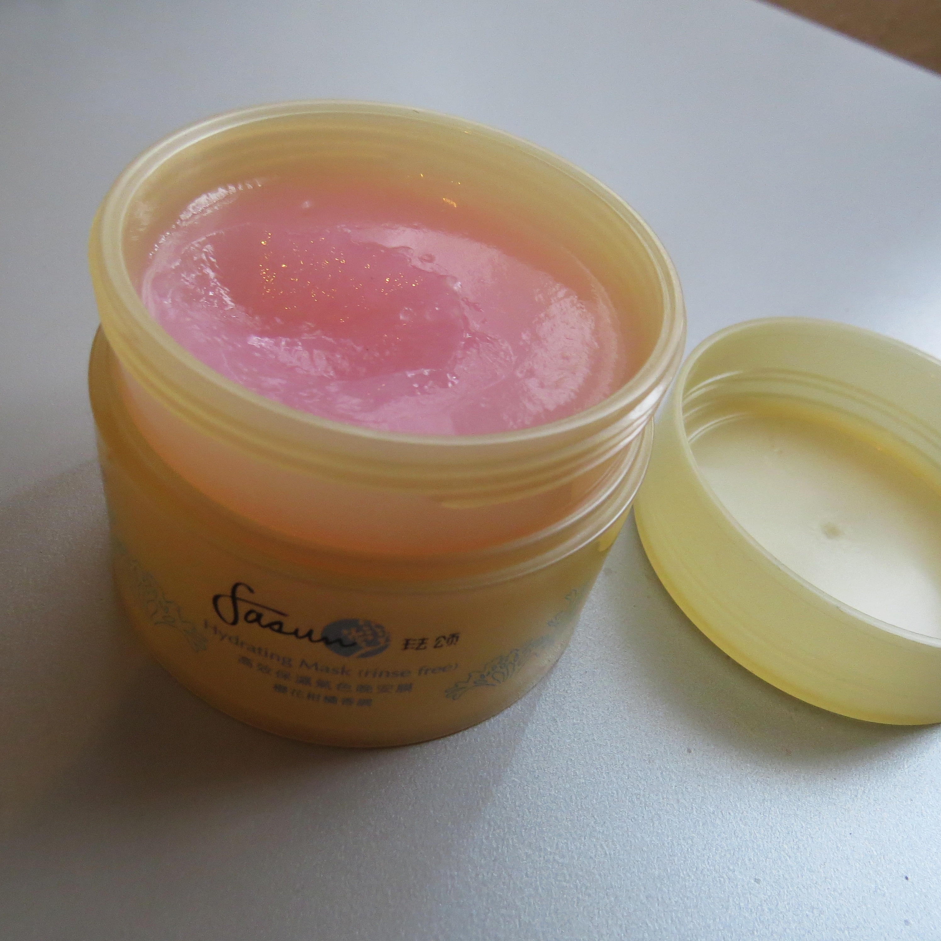 I was surprised by the colour and texture of the mask; the packaging doesn’t give any instructions in English so I took my cue from the “rinse-free” (which, presumably, means leave-on!) and applied it to clean, dry skin. Somehow I had expected a white/off-white cream colour/texture but as you can see, the mask is actually a translucent pink colour. And despite the fact that it looks like a gel, the texture is firm and almost buttery.