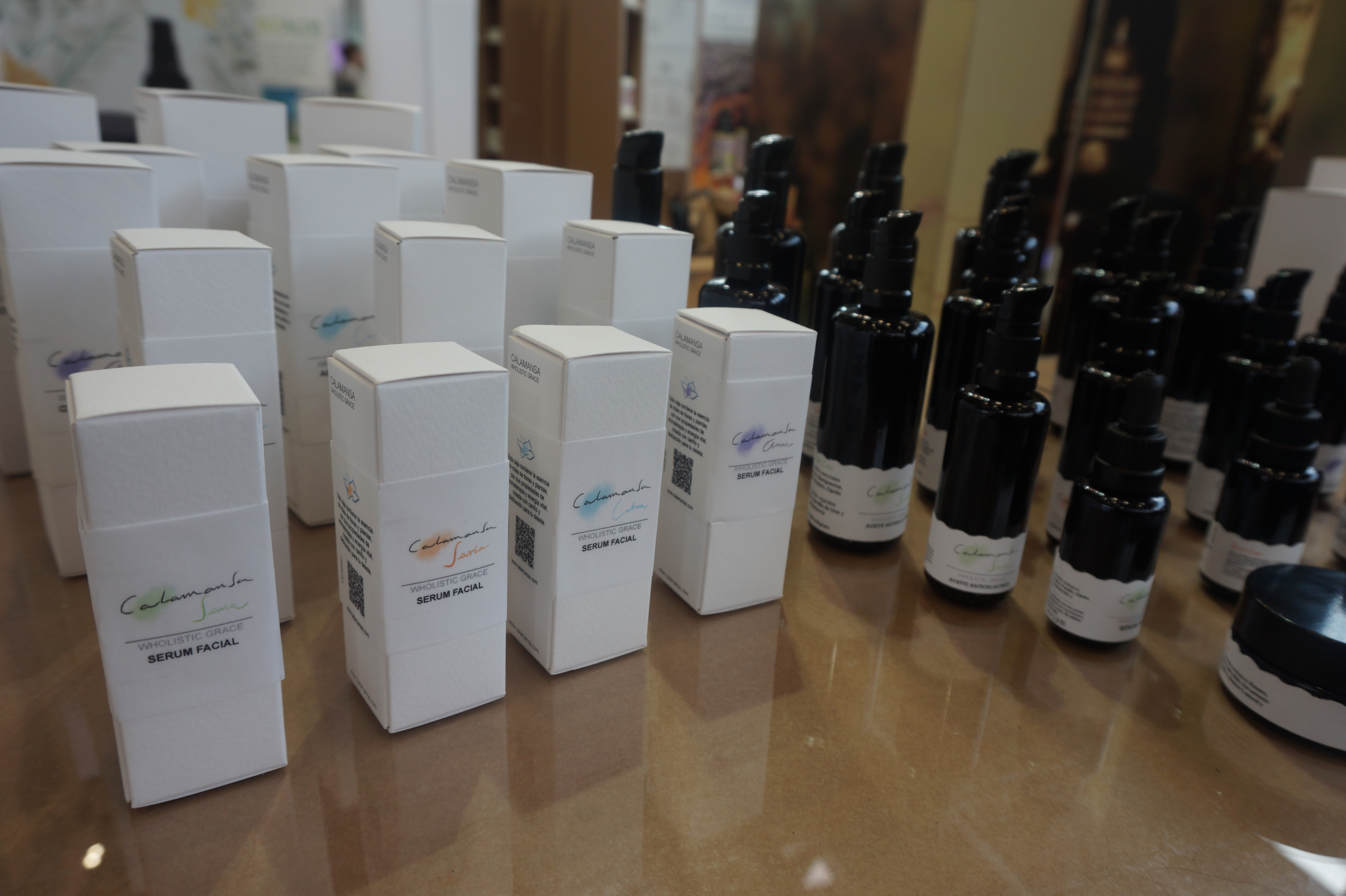Each fragrance line includes four products each: a face cream, a face serum, a body lotion and a body oil. In Spain, Calamansa is sold online and offline and they were at the trade show to look for distributors in other European countries. Products are priced between 42 Euro and 80 Euro and packaged in violet Miron glass.