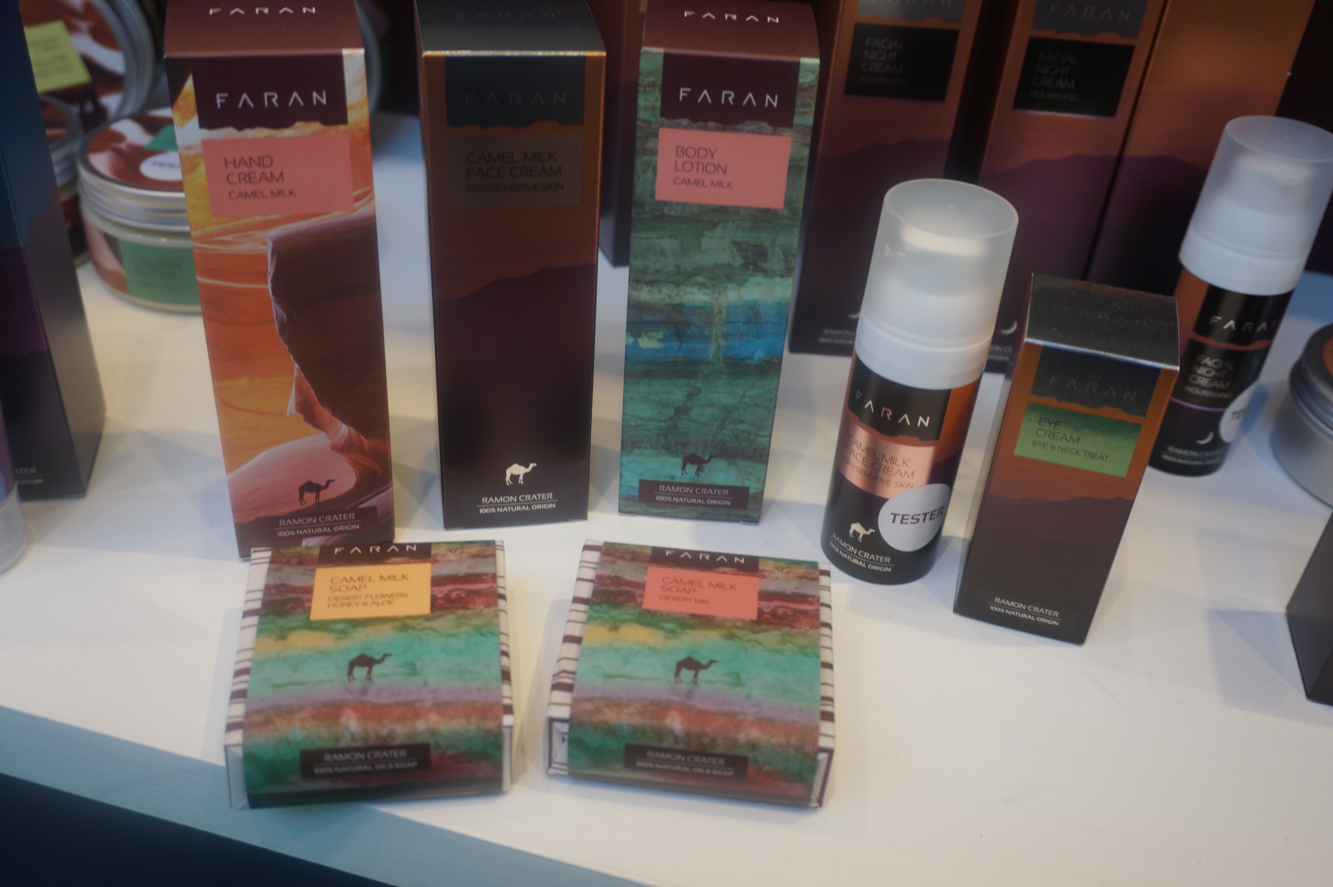 One of the first brands I met at my first Vivaness trade show, back in 2014, was Israeli brand Faran. The products are eye-catching; the outer cardboard packaging features beautiful shots of the Ramon crater in the Negev desert in Israel. The last few years, Faran had not attended Vivaness but this year, they were back! The brand’s most recent product launch is the 5-sku Camel Milk range which includes a face cream hand cream, two soaps and a body lotion.