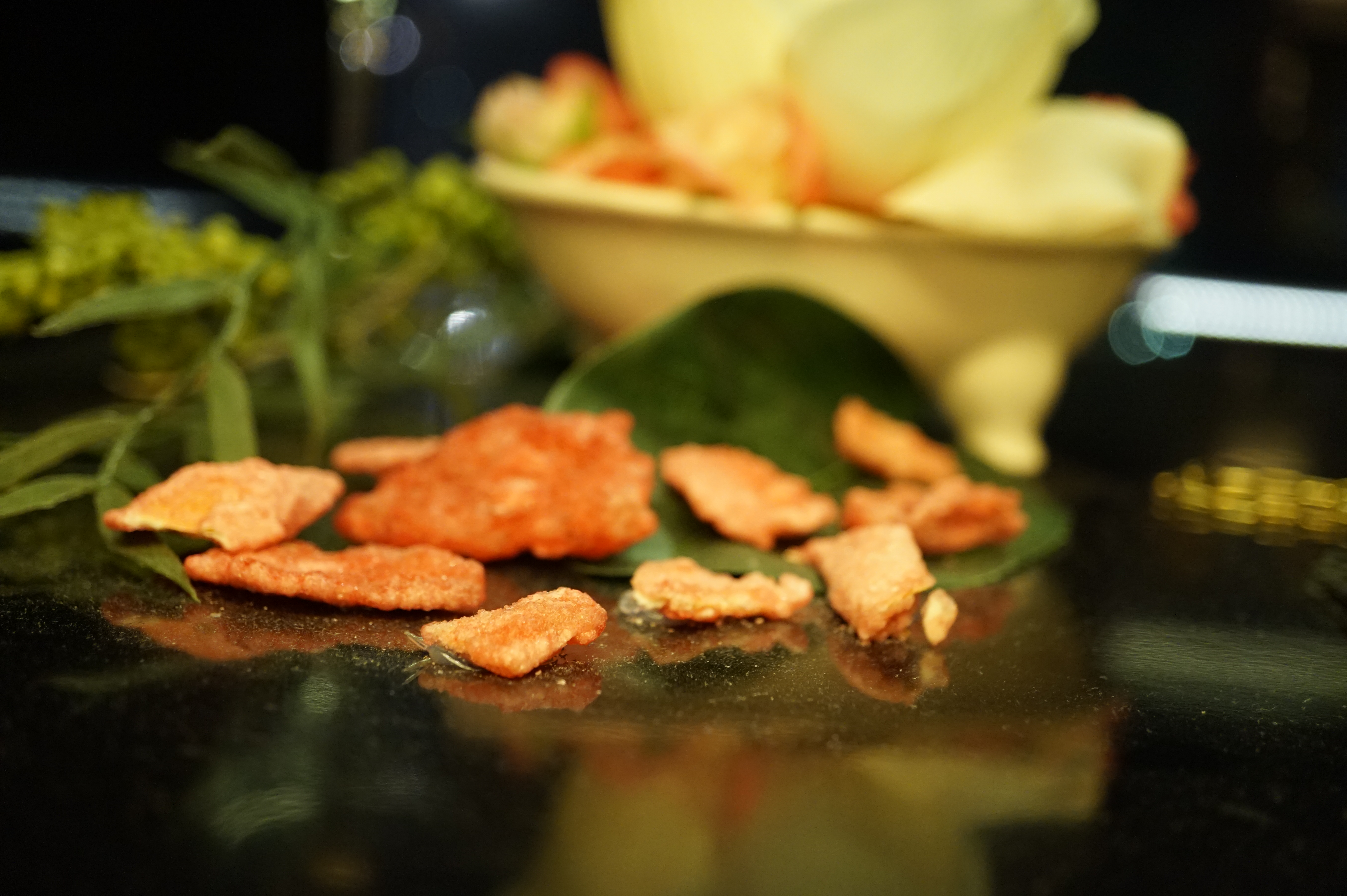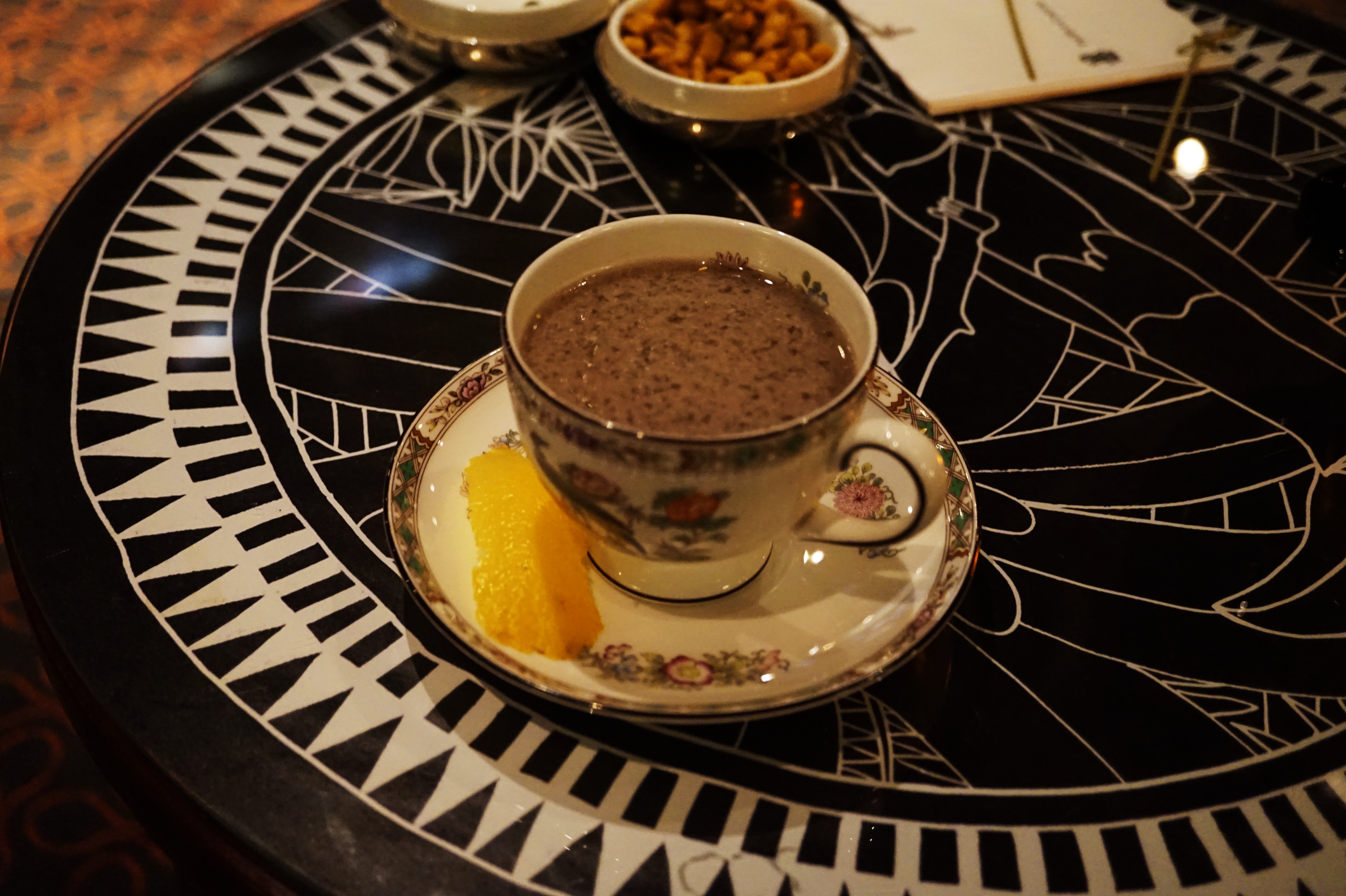 In its flavour interpretation, Vetiver Extraordinaire features a concoction of smoky Mezcal Melipús San André, Cointreau and bergamot, vetiver and sandalwood infused syrup which is shaken up with egg white and decorated with a light dusting of freshly grated cinnamon. The drink is served in a light grey stone cup. So good.