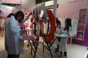 There were several activity areas. At the Essence “Mix your own Lipgloss” area (picture below) visitors could don a white lab coat and blend a personalised lipgloss – it was rather fun, actually; first you select which colours you want (I opted for cherry red with a hint of white), add different types of glitter and/or shimmer and then the fragrance of your choice.