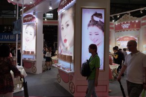 This seems to fit the character of the trade show, by the way; tickets are free and anyone can attend (there were many families with children, baby buggies and so on). The trade show centre has a bunch of really cheap restaurants as well as several McDonald outlets, Family Mart convenience stores and Kerry Parkside with its range of restaurants; there is almost unlimited seating outside (if necessary, you can picknick on the grass); most of the exhibitors sold their cosmetics at trade show prices – I think the Expo is considered a fun day out for all of the family.