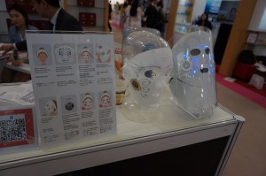 And Korean medical beauty/technology manufacturer Meditop’s MT Care brand presented the recently launched acupressure mask Ionzyme (see pictures above). It’s a cellulose sheet mask that is saturated in a serum containing niacinamide, gingko leaf extract, diamond powder and centella asiatica extract. The mask has carbon-printed patterns which are tracing the main muscles of the face and focus on five key acupressure trigger points. In either cheek (of the face mask!) is placed a magnetised coin-shaped transmitter which emits very low-level electrical impulses which are transmitted along the carbon patterns, massaging and tightening the muscles and stimulating the trigger points. The transmitter can be charged via micro USB and is controlled through a smartphone app. It can also charge your smartphone in return.