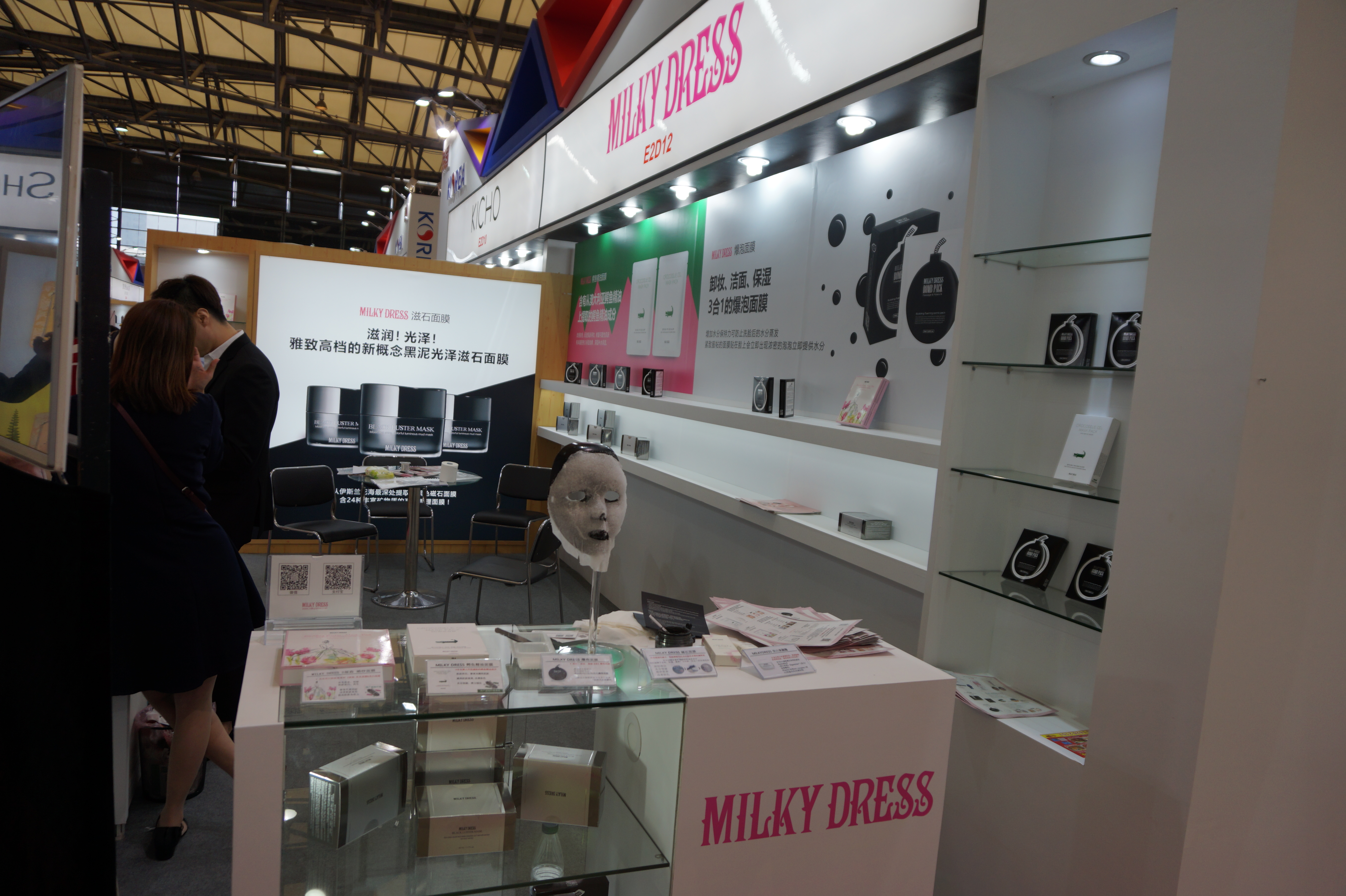 Milky Dress (JR Cosmetic) is another Korean brand which I had seen in stores in Seoul. The brand was launched three years ago and was at China Beauty Expo to look for a distributor. Milky Dress presented its Bomb Pack bubble mask sheet – I’ve never seen a bubble sheet mask (I only know the regular foam masks which are now really popular) but have since found out that apparently there are a few bubble sheet masks on the market already. Anyway, the mask (in the middle of the picture above) looks a little spooky, what with the drips of foam hanging off the face. Milky Dress’ star products include the White Platinum brightening cream and the Black Luster Mud Mask.