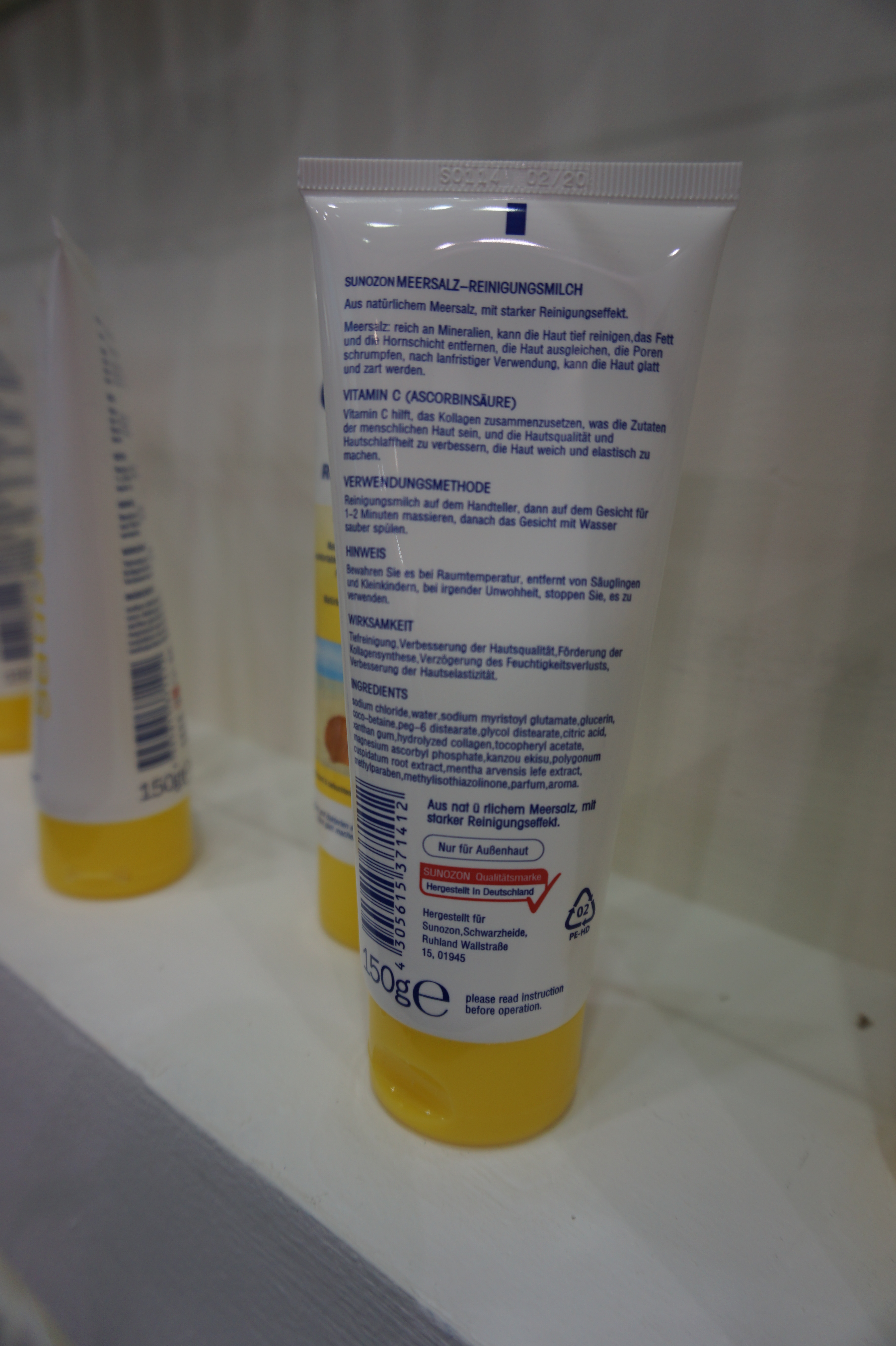 So I checked out the products and while the design on the front of the packaging (with the original German-language product name and ingredient claims) looked somewhat authentic, the back of the packaging was not. It was in German, yes, but full of typos, bad translations and layout mistakes. The usual “Rossmann Qualitätsmarke, produziert in Europa“ reads “Sunozon Qualitätsmarke hergestellt in Deutschland“ with a German manufacturer’s address in a small Brandenburg town (obviously someone just plucked a likely-sounding German town and street address).