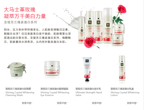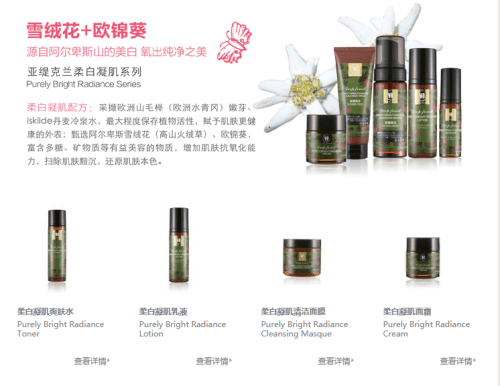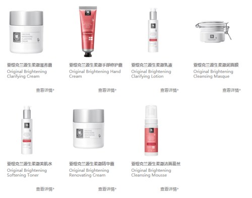 Original Brightening offers 7 sku: a cleansing cream, a “renovating” cream (regenerating cream, presumably!), softening toner, clarifying cream, clarifying lotion, hand cream and cleansing mask.