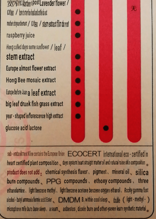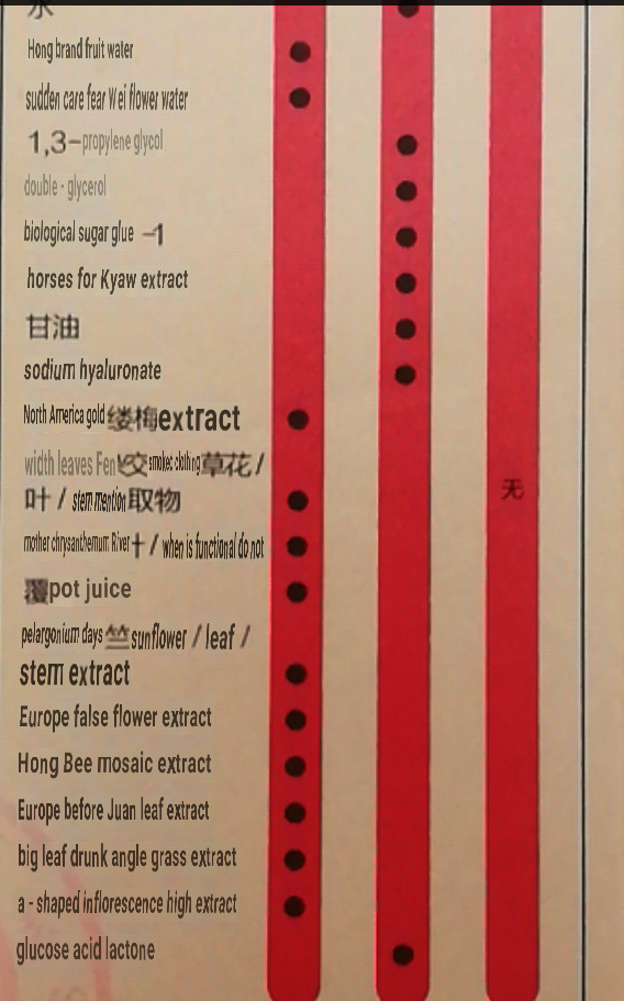 And here are some bad-quality screenshots (and some very creative ingredient translations! My favourite is the “big leaf drunk fish grass extract”) straight from the Google Translate Live App!