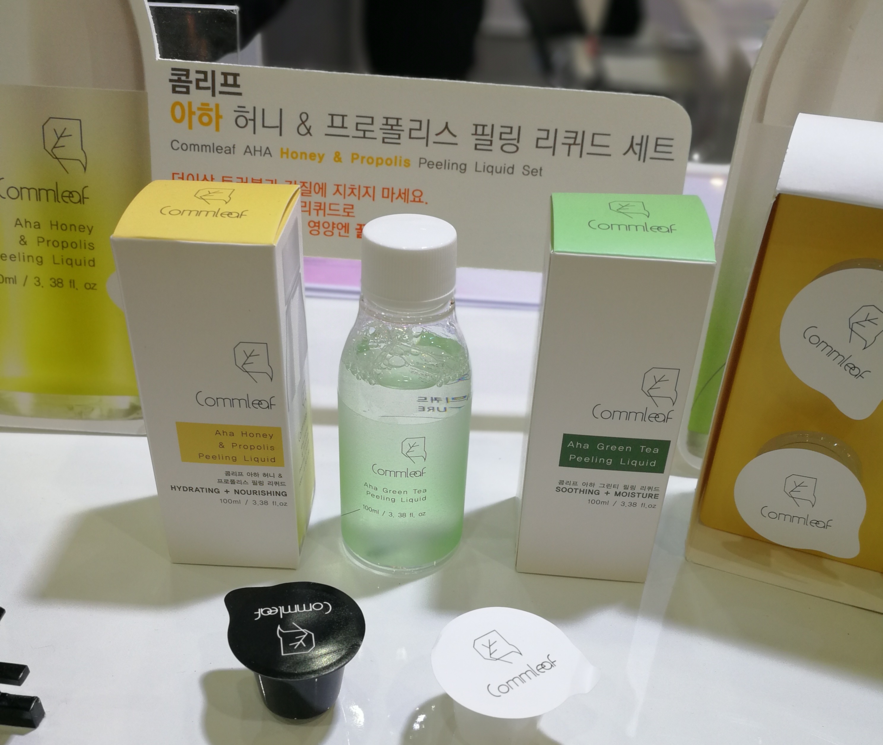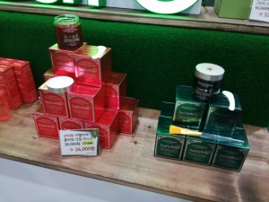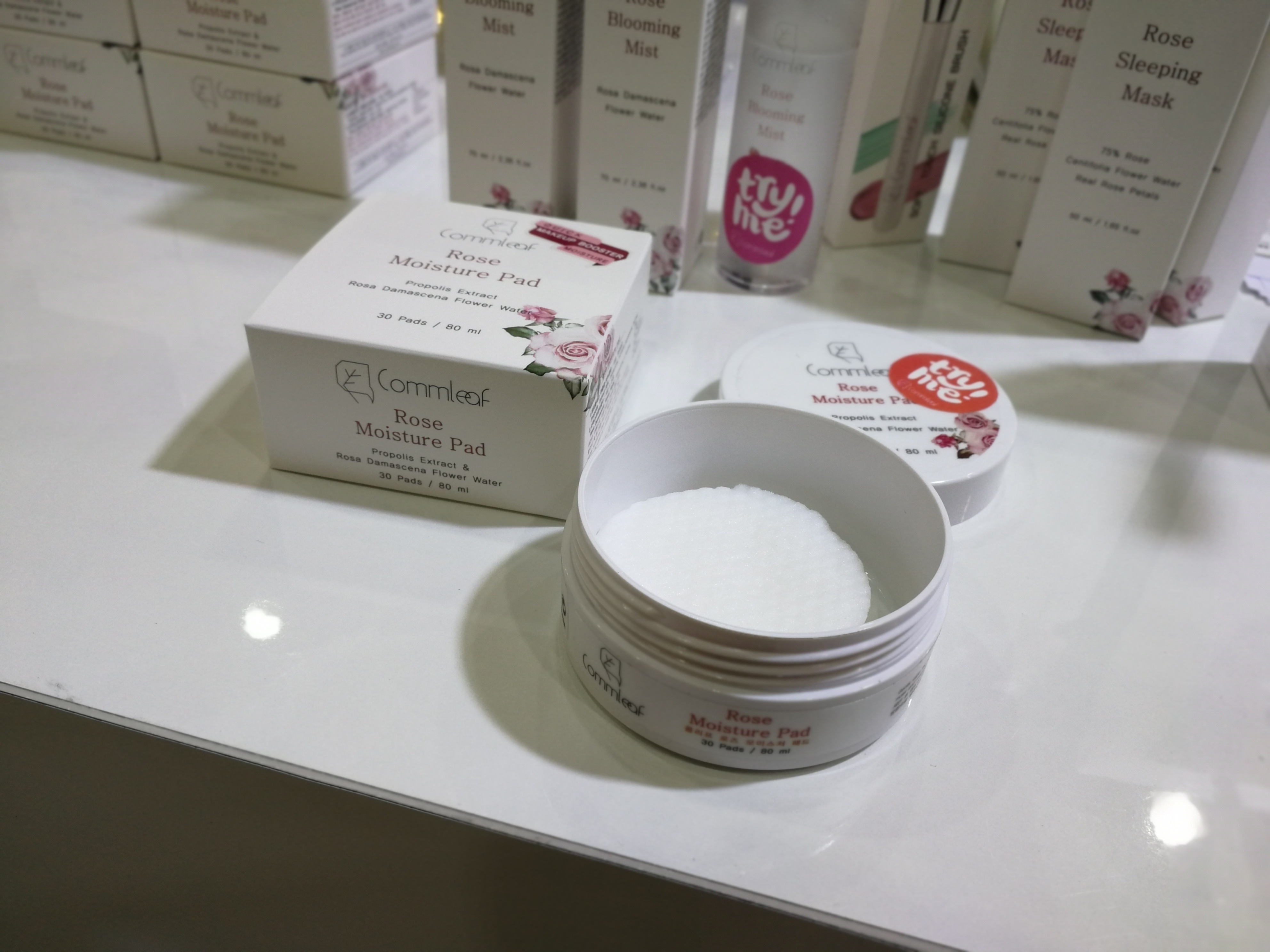 Commleaf was another newcomer brand; the natural beauty brand was launched earlier this year and currently offers five sku, including the Rose Moisture Pads (cotton pads pre-soaked in rose essence – convenient! See picture below) and two enzyme-based skin exfoliation treatments I found particularly intriguing. AHA Honey & Propolis Peeling Liquid and AHA Green Tea Peeling Liquid contain blueberry leaf extract, sugar cane extract and sugar maple extract to gently exfoliate the skin. In addition to this active blend the Green Tea variant contains, well, green tea extract and the honey & propolis is made with, ahem, honey and propolis.
