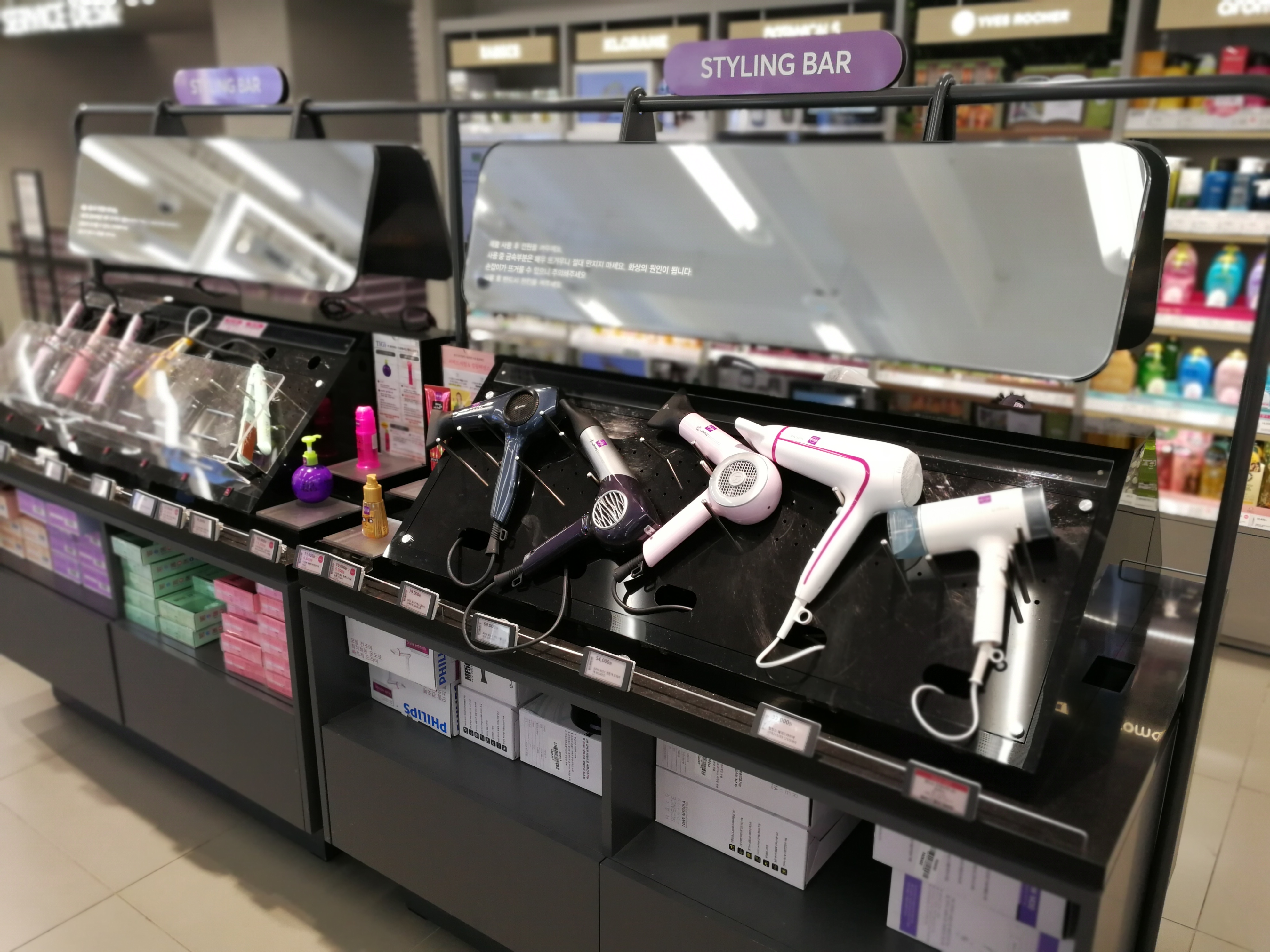 Here you’ll also find men’s grooming, hair care and hair styling; including Olive Young’s classic styling bar – a shelf with plugged-in hairdriers, tongs, curlers, straighteners and other heated styling tools. Strategically placed mirrors allow you to quickly restyle your hair and try out the different styling tools at the same time. Why don’t we have this kind of thing over here in Europe?