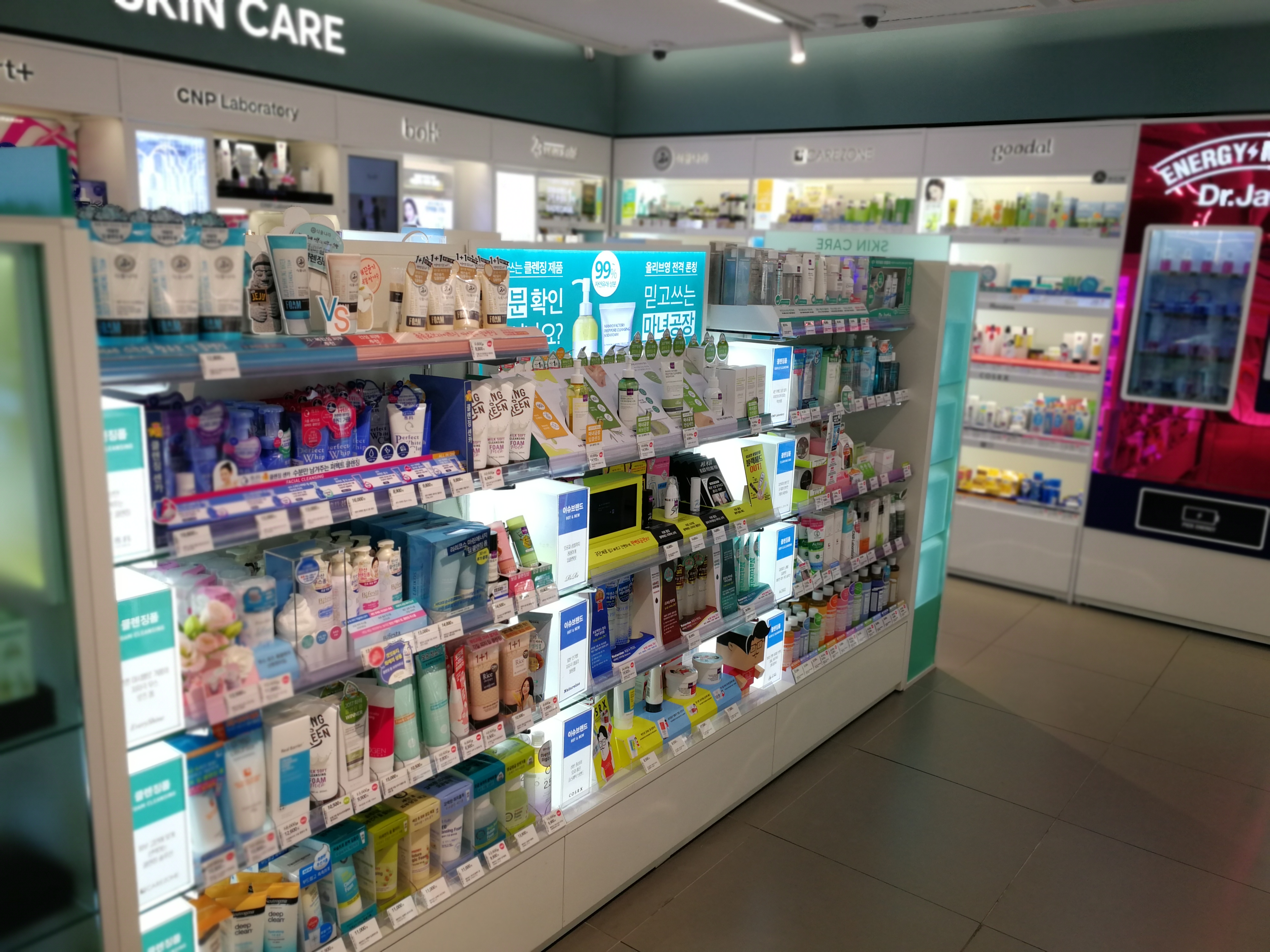 First floor (2F): Skin care!! Face care and body care, with a massive section dedicated to sheet masks alone. The brand line-up is more drugstore-oriented than Chicor (which is a straight-up perfumery) and offers a mixture of Korean mainstream – Dr. Jart, Isoi, Lirikos, Carezone, Goodal, Neogen, DermaLift, 23 Yrs Old and CNP Laboratory – and more niche-ey labels such as CosRX and Dr. Frog.
