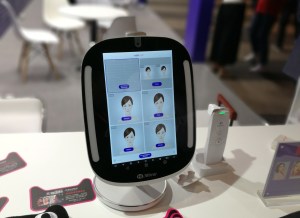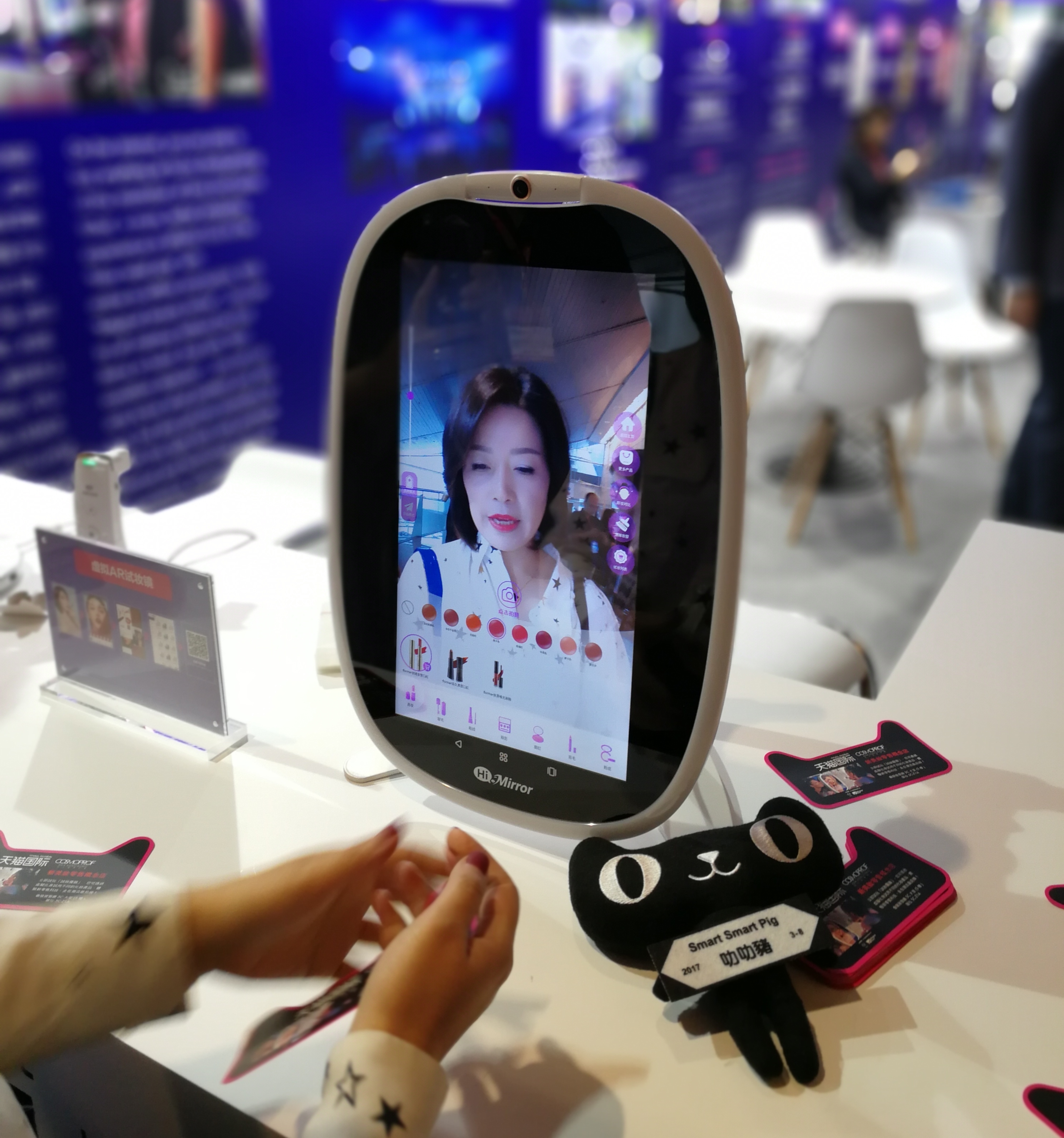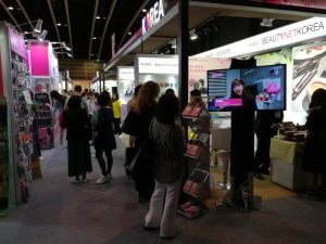 The Makeup Mirror, see pic below, allows you to try out different makeup looks with products from a specific brand. The face in the mirror is that of the trade show visitor standing next to me, you can see her hands in the lower part of the pic.