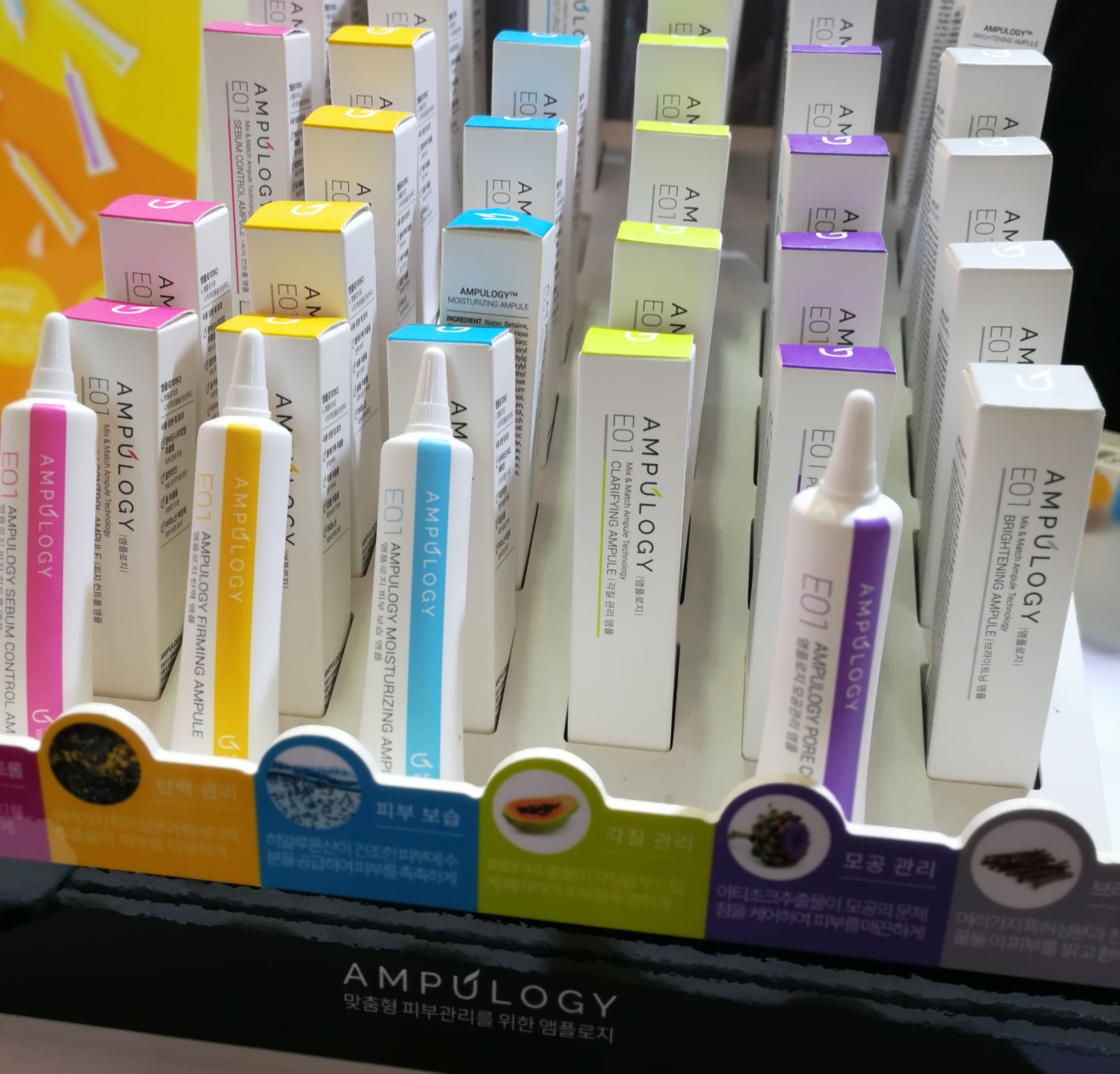 The six Ampulogy serums are beautifully packaged –I just love the colours of the product display! – and the products are available in Korea in a number of duty free malls, including Shinsegae Duty Free and Shilla Duty Free as well as various beauty salons. I was told that the brand is also sold in Russia and mainland China and at the moment the company is also in talks with distributors in the UK and France.
