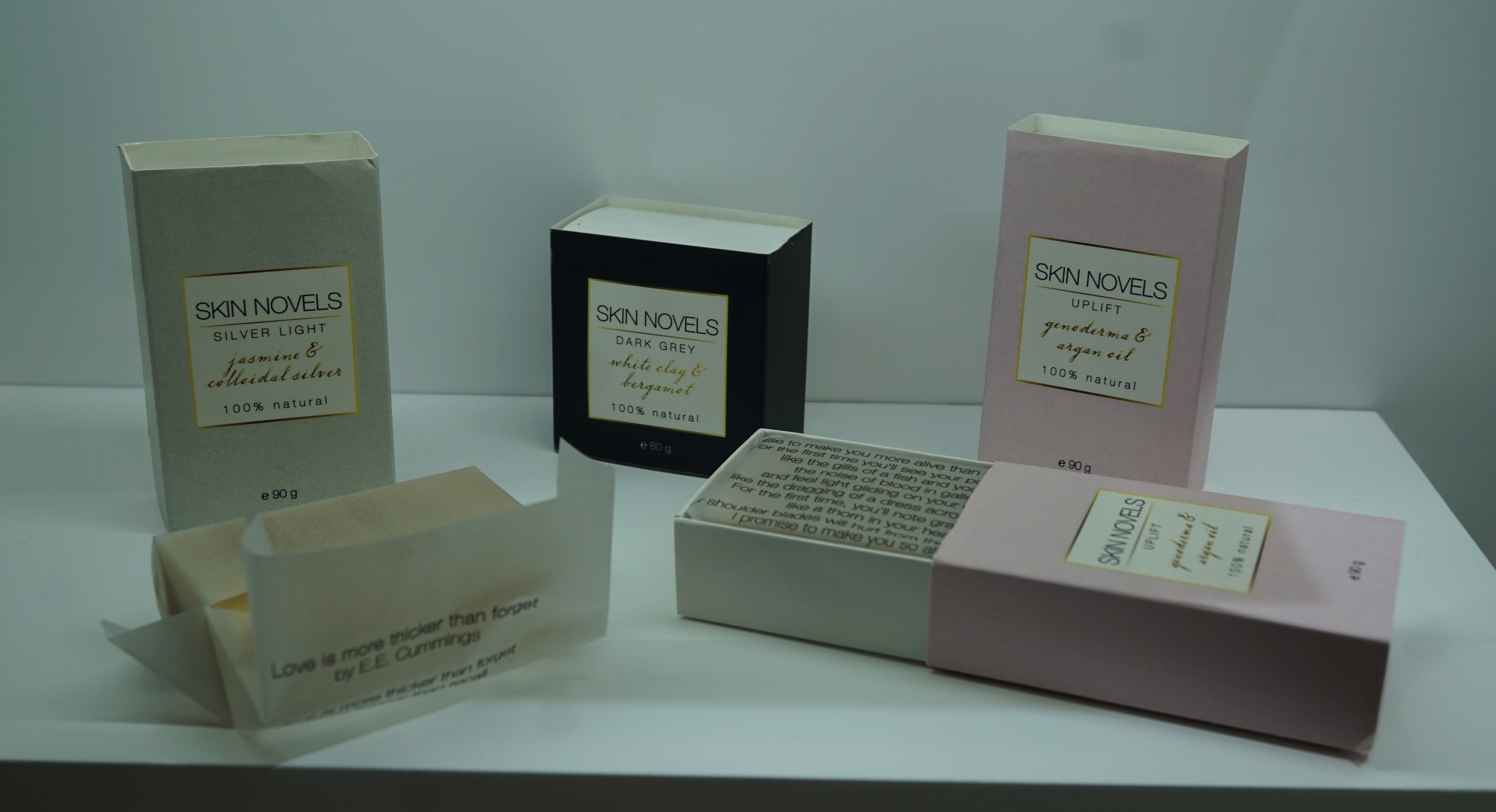Skin Novels is a young artisan beauty brand from Romania. The company makes beautiful bar soaps (by hand) – their pièce de resistance is undoubtedly the gorgeous gold flake soap (which contains 24 karat gold leaf, see first pic below). Skin Novels’ product portfolio comprises 11 bar soaps. I particularly like the packaging; the wrapping paper is decorated with quotes and poetry and the poem usually reflects the key ingredients or the product name.