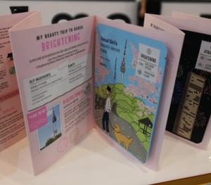 Entitled “My Beauty Trip to Korea” the travel pack is a fold-out mask set which is designed to look like a travel scrap-book. Each double page features a sheet mask and, on the opposite page, tourist tips and pictures. This is one of the most attractive and on-target travel beauty packaging designs that I have ever seen.