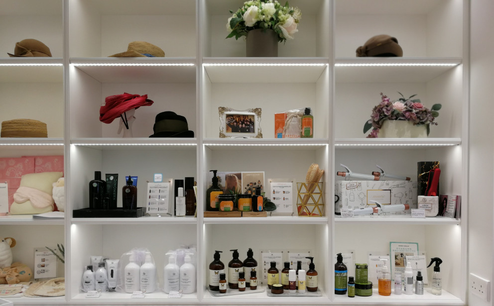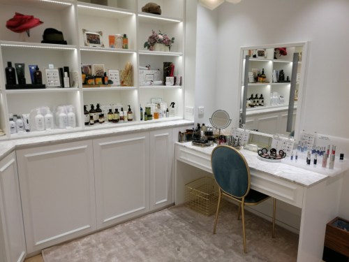 Towards the rear of the store is a makeup table corner which has has a distinct boudoir feel to it, with a sink (and paper towels) located next to it so you can try out liquid and foaming products properly.