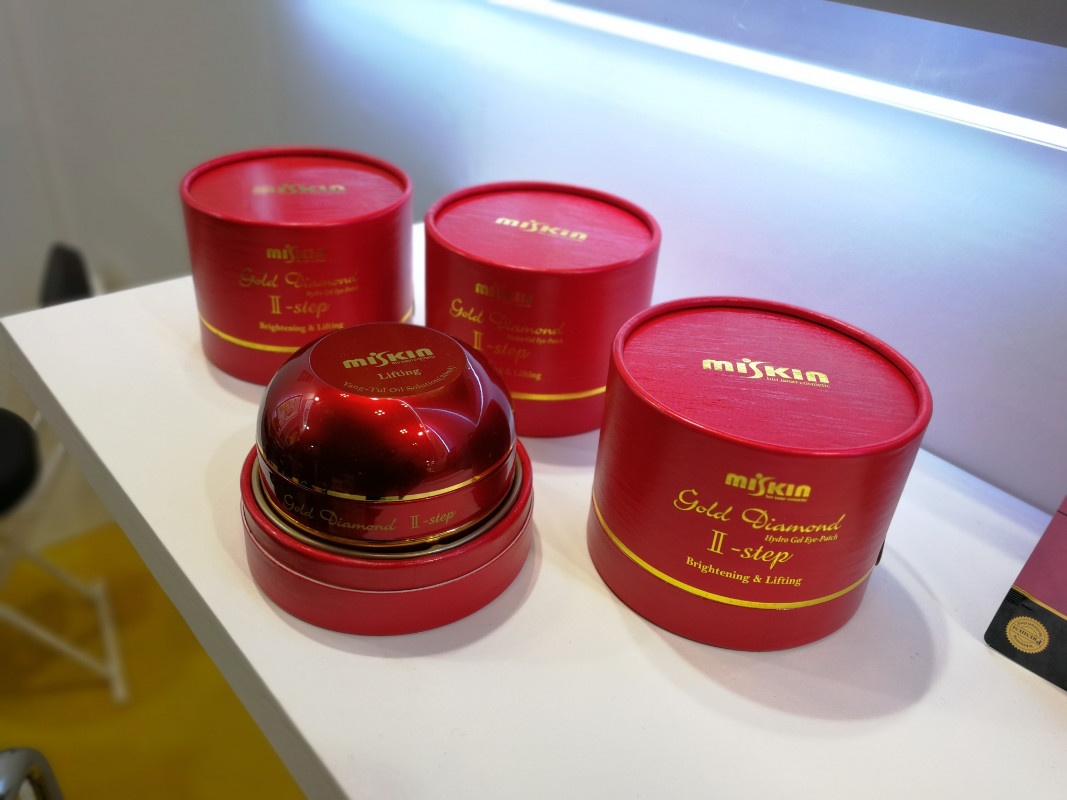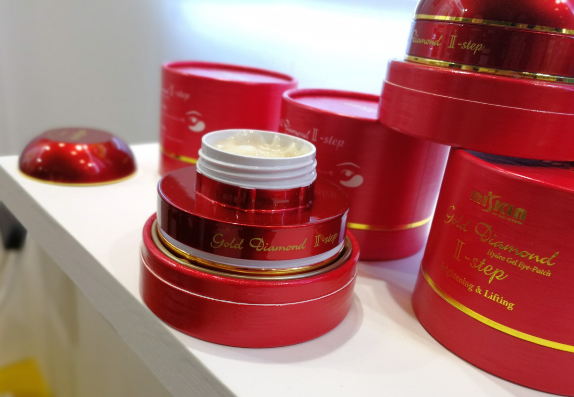 Check out the complicated red and gold packaging! This is Korean anti-ageing brand Miskin and its newest product, the Gold Diamond II-Step Hydro Eye Gel Patch & Cream. The two products, undereye hydrogel masks and moisturising cream, are packaged in the same container.