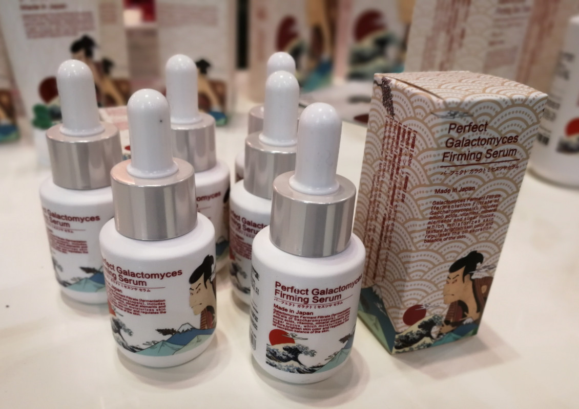 Mitomo also manufactures various ranges of ukiyo-e (traditional Japanese wood cuts) decorated beauty products. The company’s newest launch is the Ukiyoe Samurai range for men (see pic above): there are two sub-ranges which are both formulated with galactomyces ferment filtrate. Each sub-range comprises four products: sheet mask, peeling gel, skin toner and firming serum – the range packaged in black is the Purifying Galactomyces range, the products in the white packaging (see pic above) are the Brightening Galactomyces range.