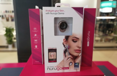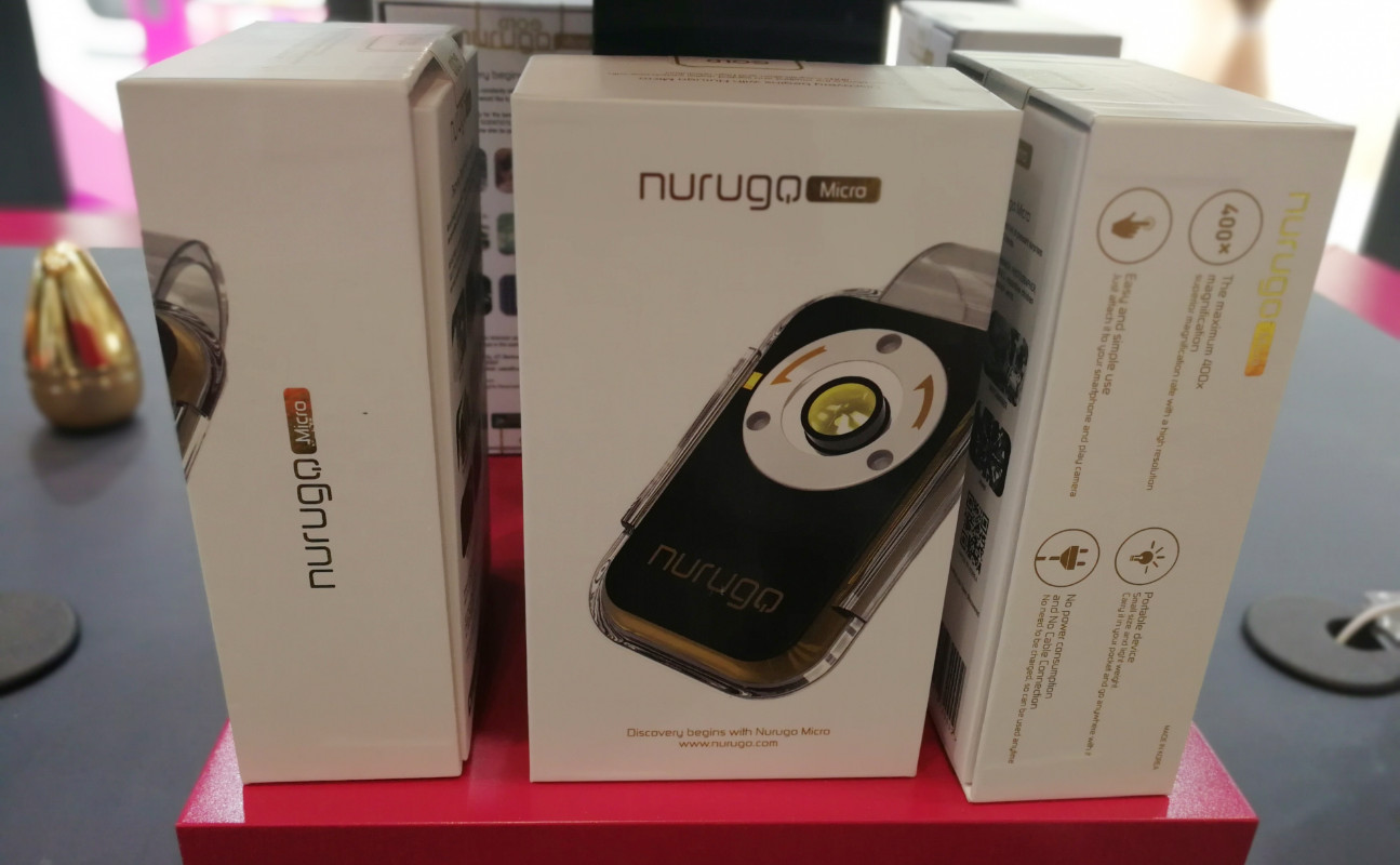 And Nurugo Micro (see pic above) is an awesome microscopic lens which you simply attach to your phone; same set-up as Nurugo Derma: it clips on with a bracket and is charged by the camera flash. The Micro lens magnifies for up to 400x; it really is fascinating: we tried it out on fabric, hair, skin – wow. As mentioned above I bought both gadgets the very next day: RRP are 50 USD for the Derma analyzer and 75 USD for the Micro lens. Disclosure of trade show discount: 20 USD and 30 USD respectively.