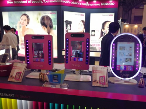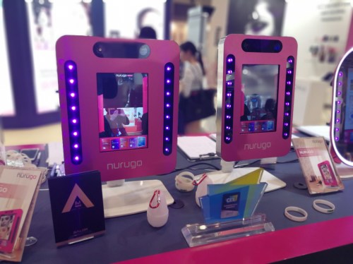 Nurugo is Korean biometric tech manufacturer Virditech’s beautytronics brand: a range of skin analyzer/diagnostic tools which are really cool. First there is the UV Protection Screen Mirror which shows you the state of your skin’s UV protection – the parts of face, neck, hands, whatever that are exposed to the sun without any protective cream or stick appear white, skin areas that ARE protected appear in black. This big mirror you see in the two pics below is a B2B product, designed for stores and salons. There is also a portable version which plugs into your smartphone.