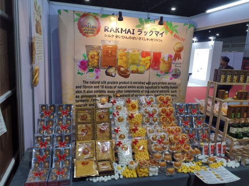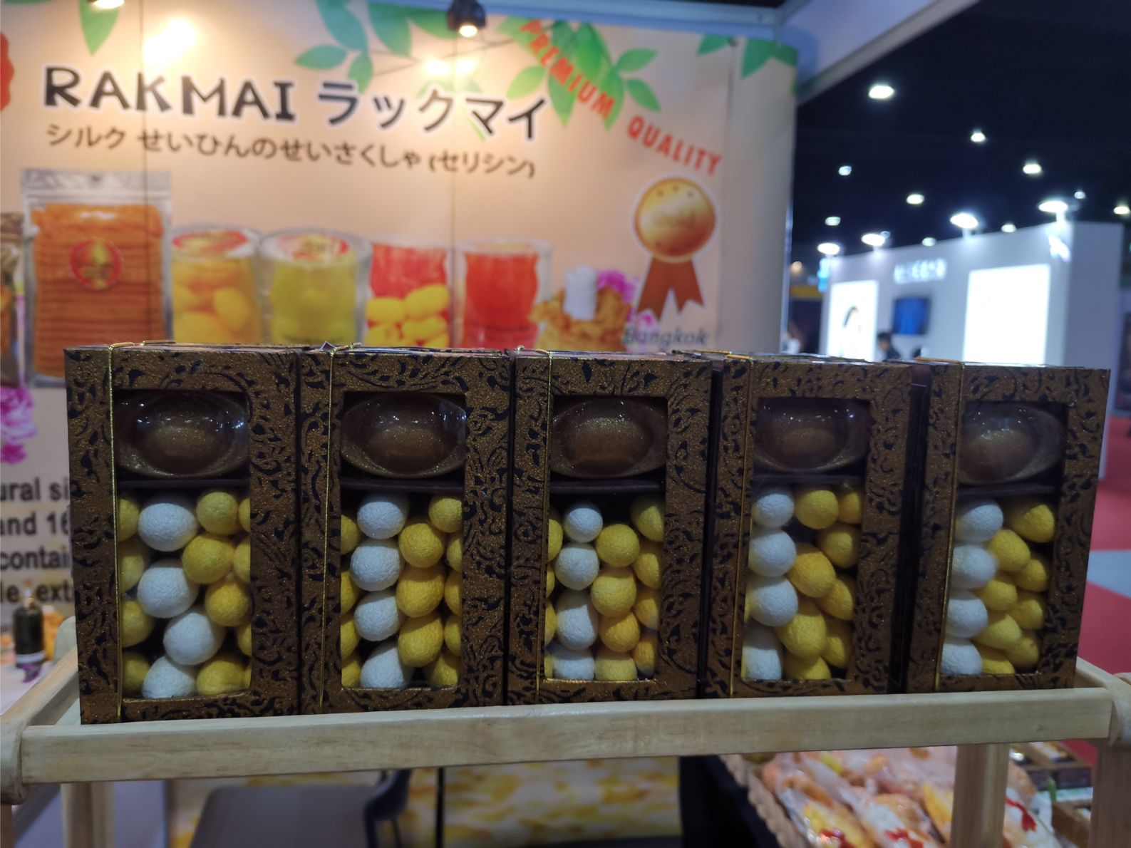 Anyway, Thai exhibitors at BBAB included a number of spa brands. Like Rakmai which offers skin and body care formulated with traditional Thai ingredients, especially silk protein derived from discarded silk worm cocoons. The brand’s range includes a Serum Silk Soap formulated with silk proteins and available individually or in a gift pack together with silk worm cocoons to be used as skin massaging devices – they make awesome exfoliating finger mitts! See pic directly below.