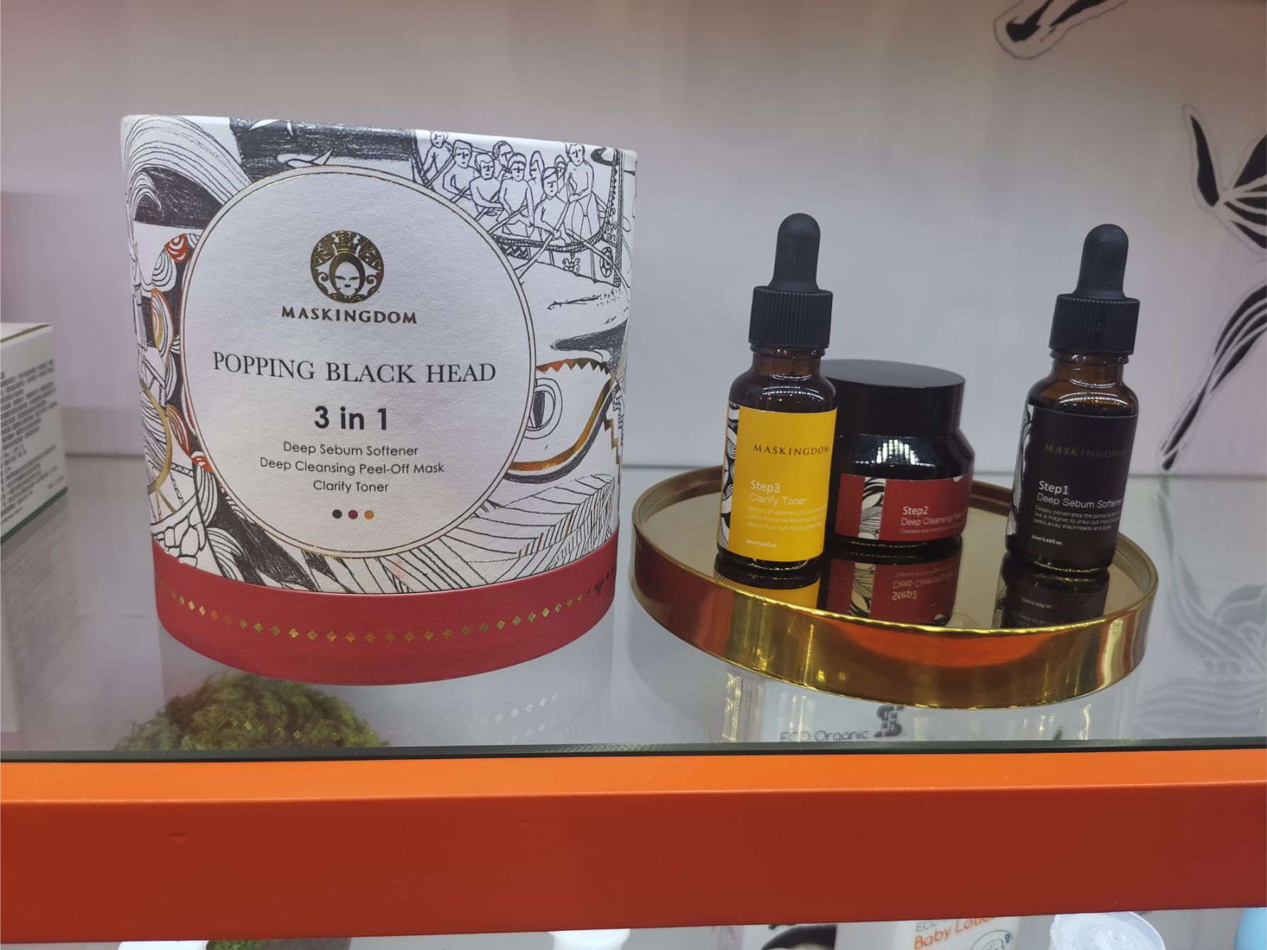 Maskingdom always presents at least one product innovation at Cosmoprof Asia and this year there were no less than five; all from the cleansing category. First up is the Popping Black Head mask kit (see pic above), a 3-step skin care routine to battle blackheads in the nasal area! First dab on a serum to soften the sebum, then apply the creamy black mask to the nose (it will harden out and can be pulled off like a nose strip) and follow up with a moisturising serum to soothe the maltreated skin.