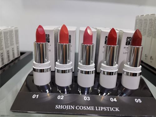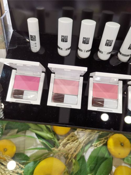 Shojin Cosme’s product range comprises five lipsticks and five lipglosses (both have a semi-translucent shiny finish), a clear lipbalm, three powder blushes and three powder eyeshadows. With a price range of 1500-2000 Yen, the brand is positioned in the upper mass market category – these are the prices you’d expect to pay for most Japanese drugstore makeup brands.
