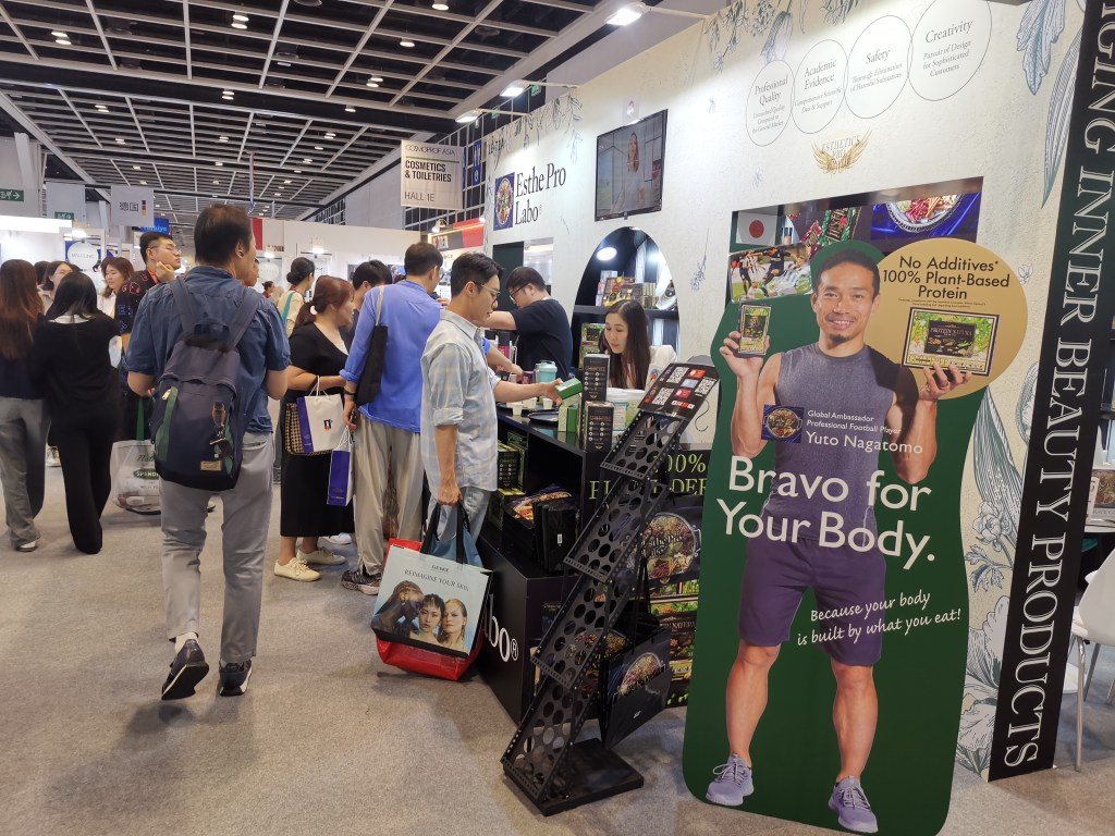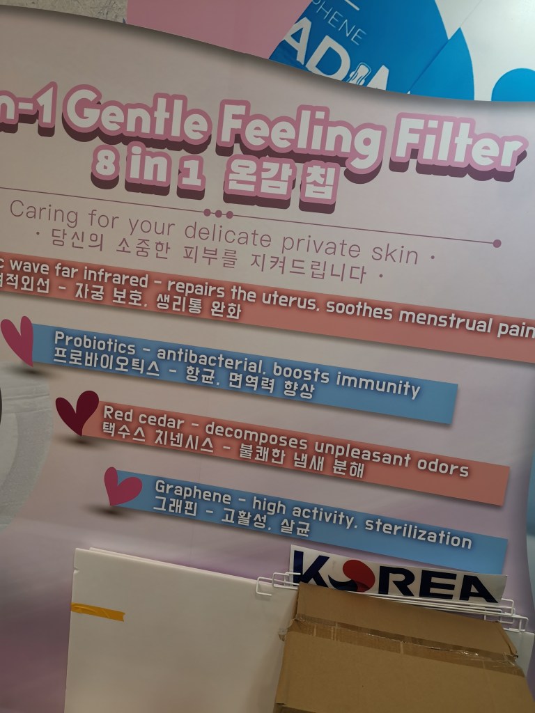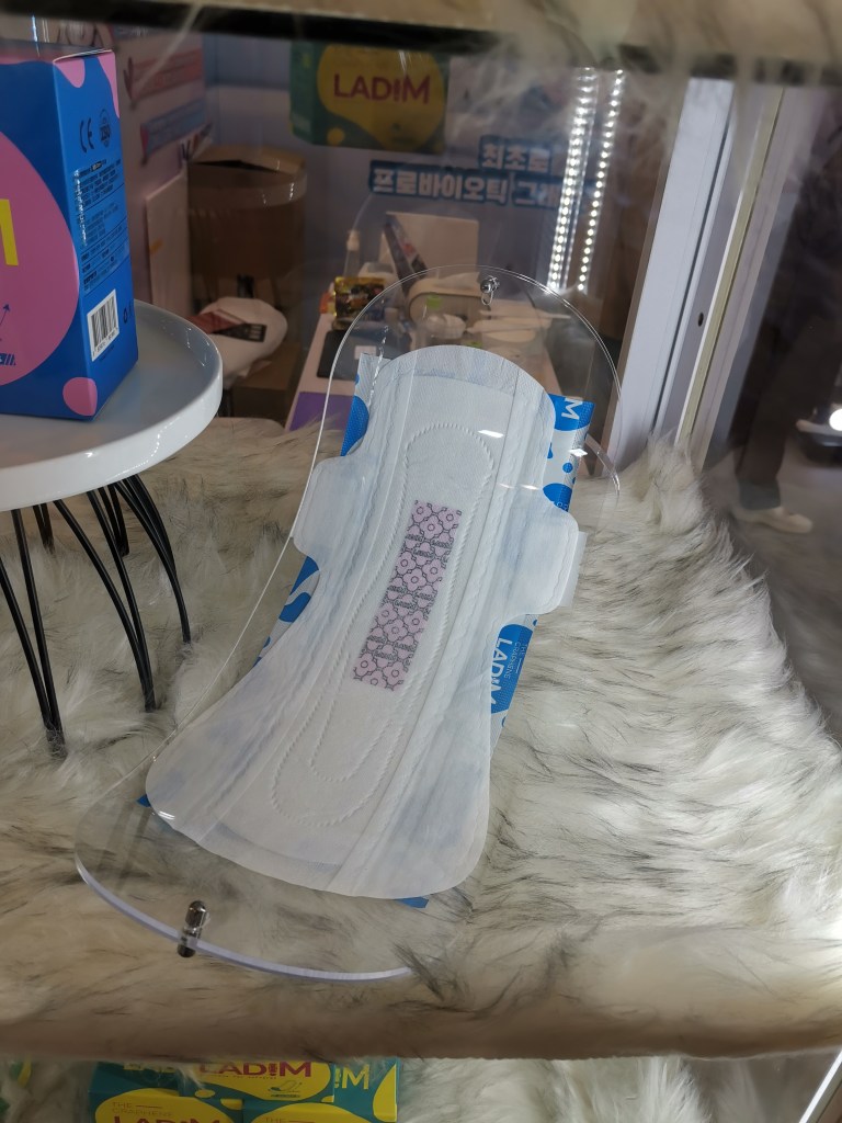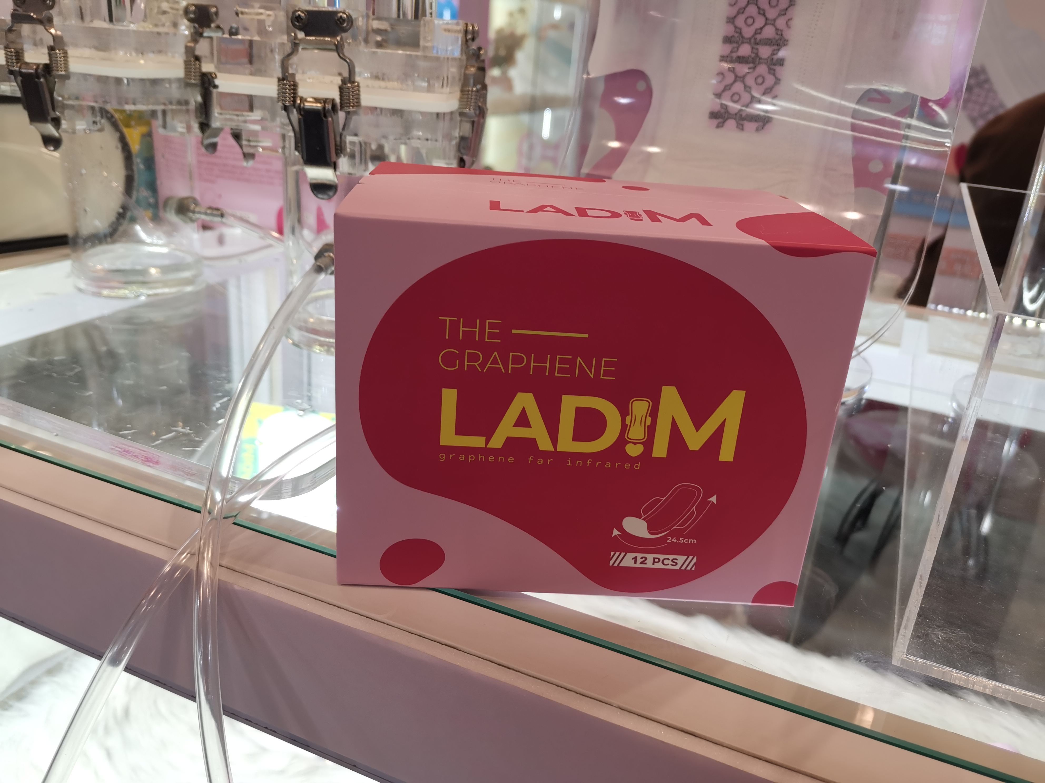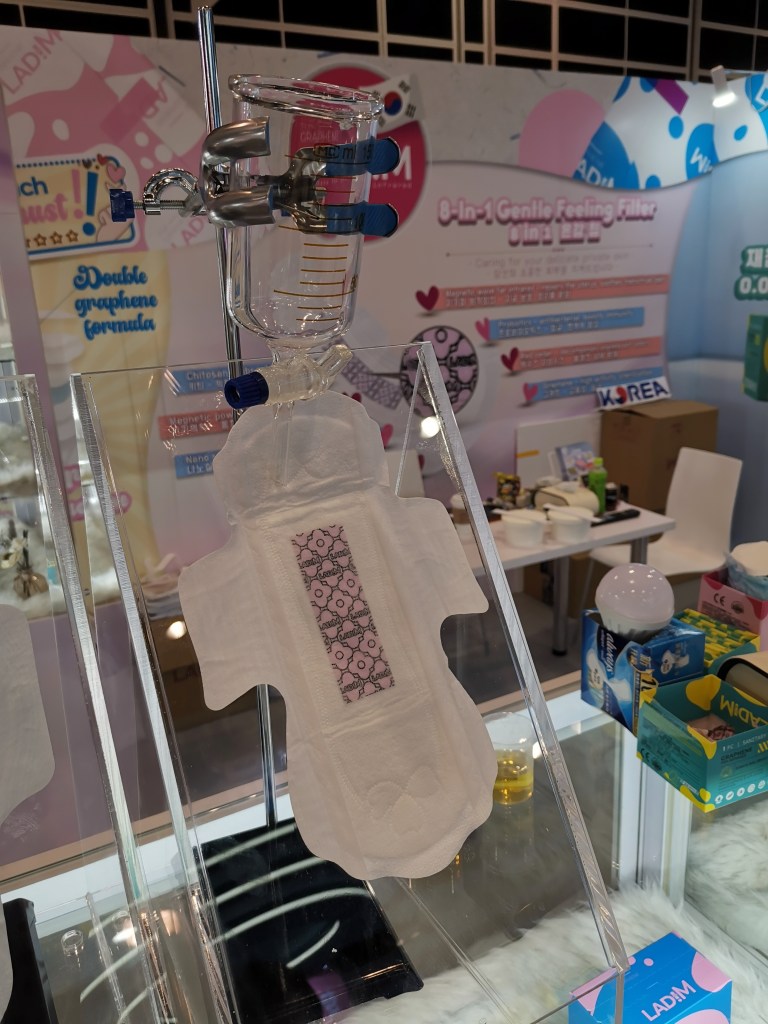 Another vaginal wellness-oriented launch from Korea came from menstrual care brand The Graphene LadiM whose booth was around the corner from Luminiel. Manufacturer Konxept Limited has developed menstrual pads and pantyliners featuring a small rectangular strip which is based on graphene and said to be particularly absorbent. And the product demonstration at the booth – two vials of liquid, on placed on a Ladim pad, the other on a regular pad from a different brand – certainly looked convincing enough.