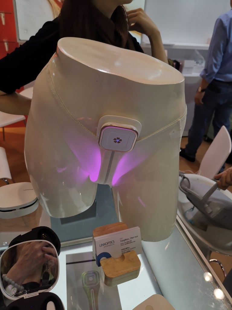 It took me a few seconds to realise what Korean manufacturer Vivilux meant by “Y-care” – this is an LED device to treat the female vaginal area with a mixture of anti-inflammatory and soothing red, blue and amber lights. The Luminiel is shaped like a pantyliner and comes with a USB-rechargable battery pack. Stick it into your underwear, turn it on and, yes, you get a fun personal light show as well.