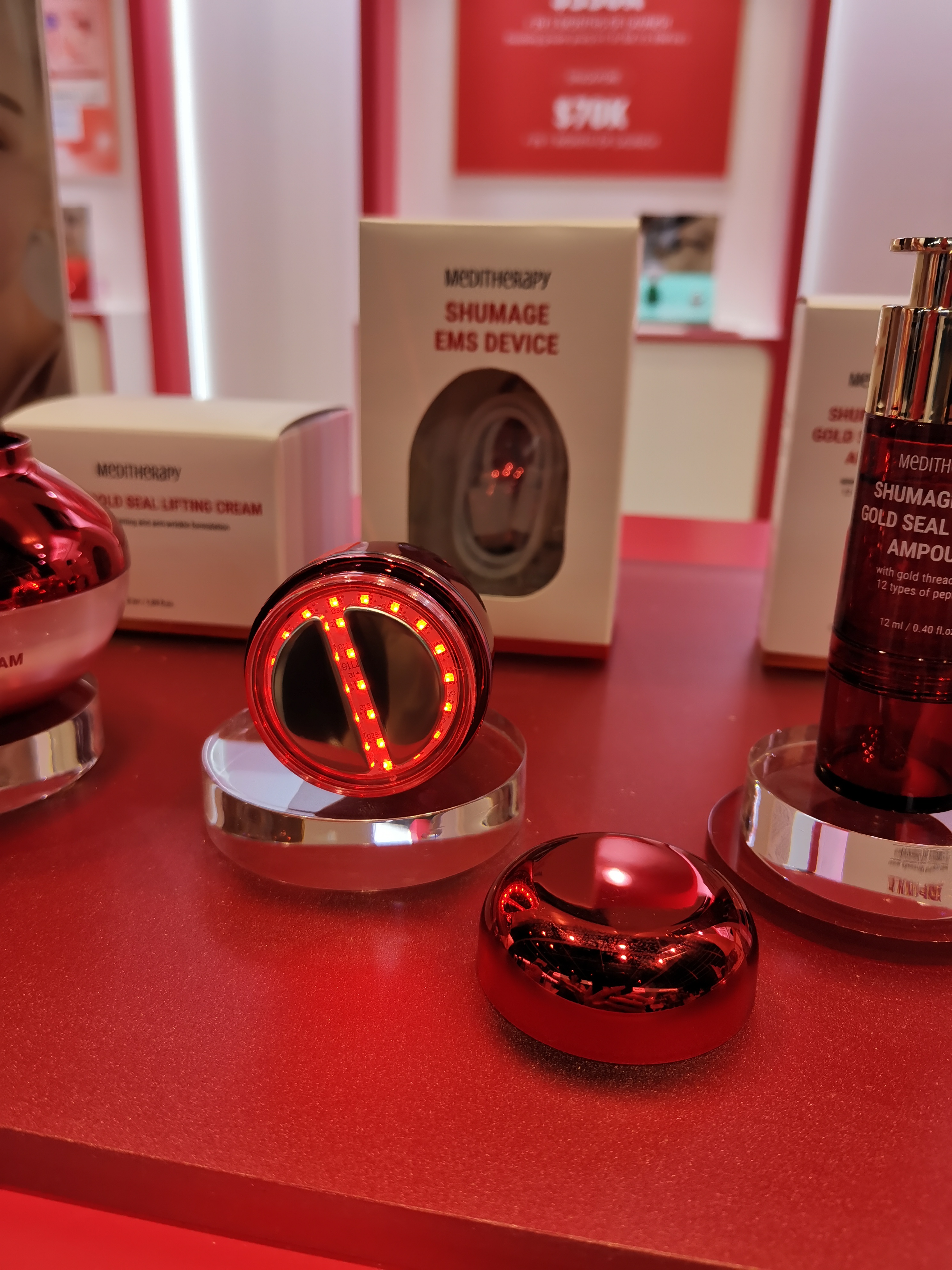 New from Korean beauty brand Meditherapy: The anti-ageing Shumage range, five high-tech face care products (hydrogel mask, face cream, micro-needle dermo patches, ampoule and face cream) plus a rather cute little EMS skin massage device designed to be used in conjunction with the face cream.